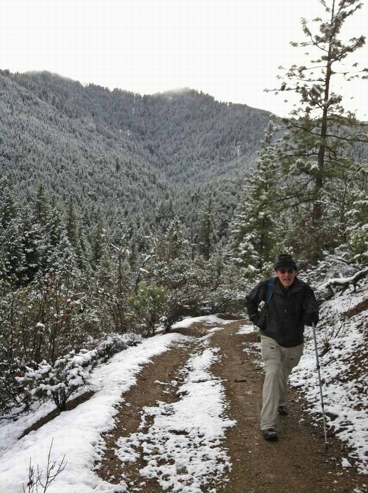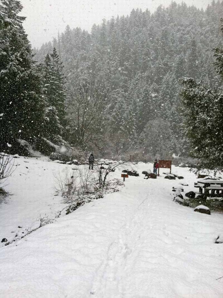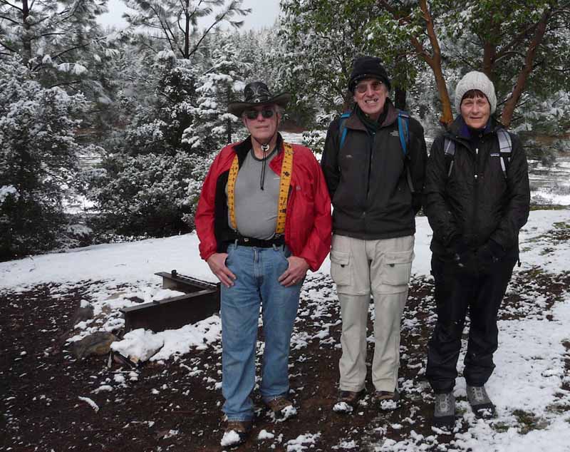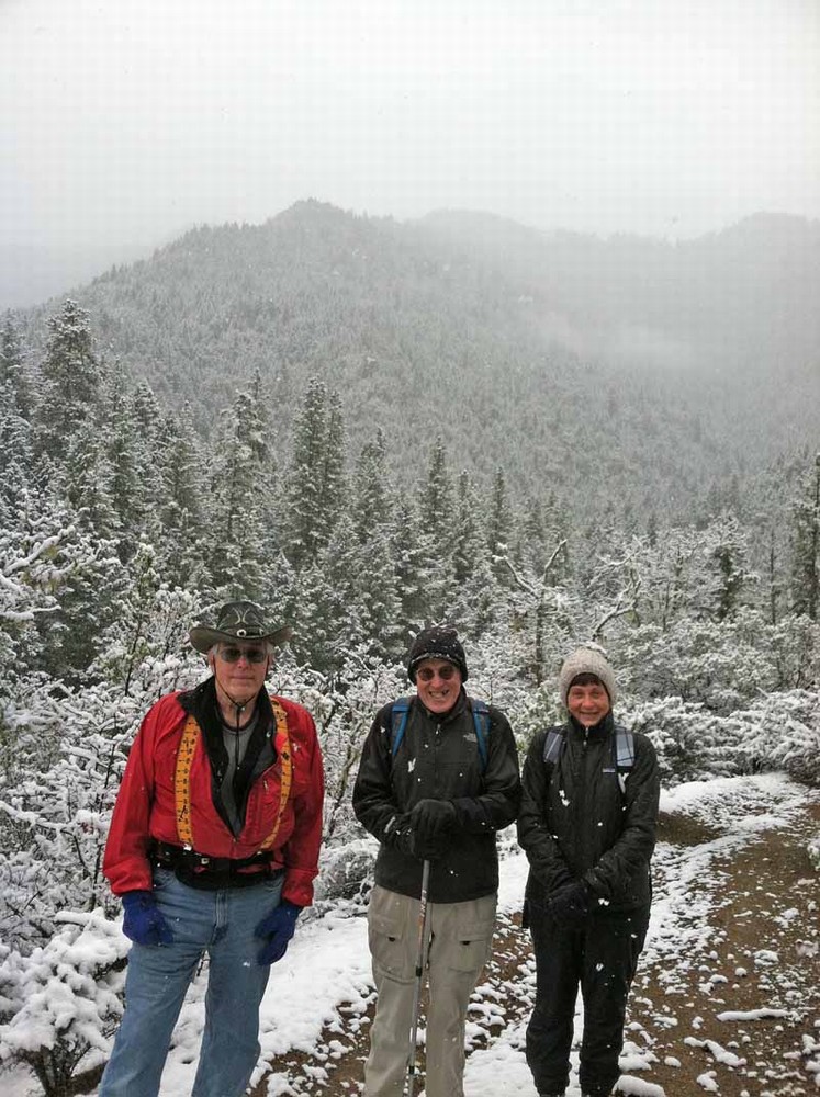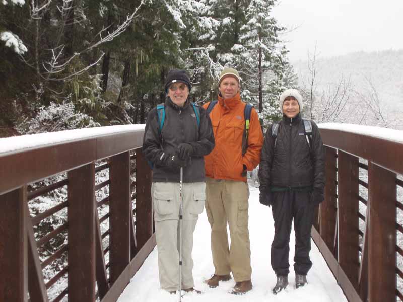 Well, instead of snowshoeing as had been on the schedule, we went out to Applegate Lake. We drove to the Dagelma trailhead (uphill from the French Gulch trailhead). We hiked down Osprey to the Payete trail and past both Hal’s point and Hank’s point to a point three miles from the bridge. It began snowing fairly well when we stopped for lunch and about half the way back. We did have uphill the last half mile of our hike.