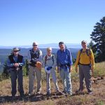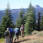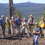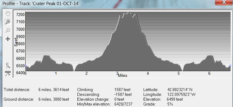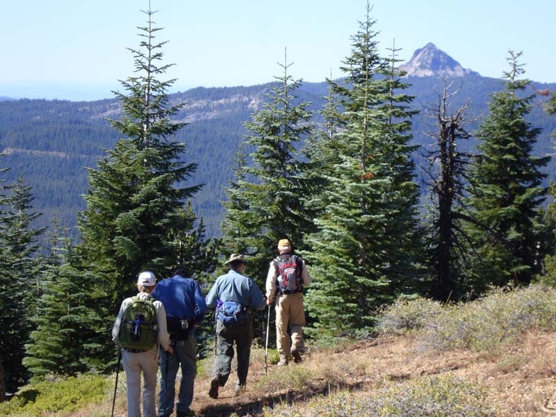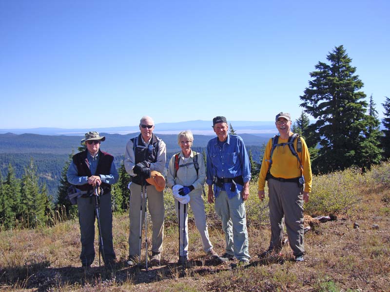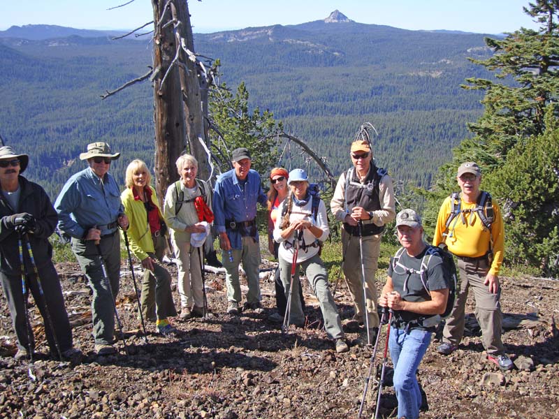 The drive from Ashland was 1:55 via Ft. Klamath. One car from Ashland and one from Medford arrived a bit before 10:00. We thought that there was possibly another car from Medford but when they hadn’t arrived by 10:05 we started off. The third group arrived minutes later and waited a bit at the trailhead because they didn’t recognize either of the two earlier arriving cars. It all turned out OK though, when the two groups met walking on the Crater Peak rim; one group went clockwise while the other one went counterclockwise and we eventually ran into each other.