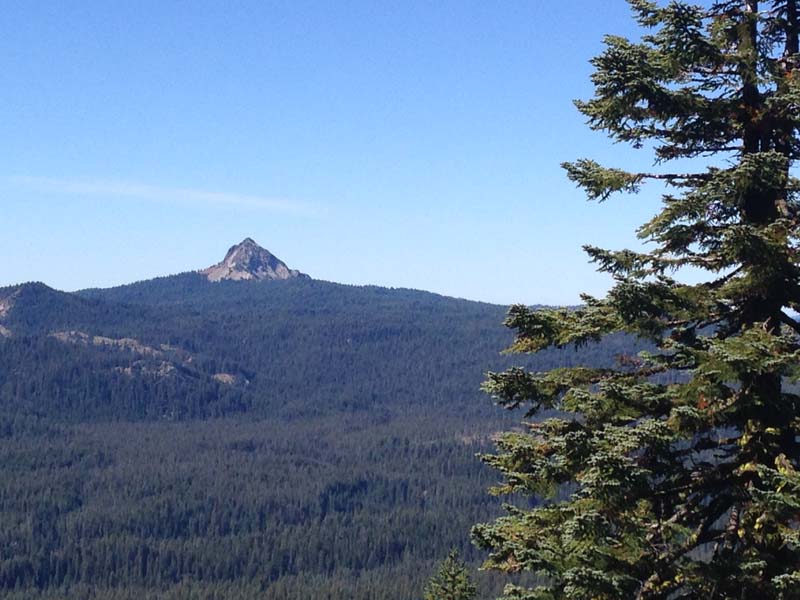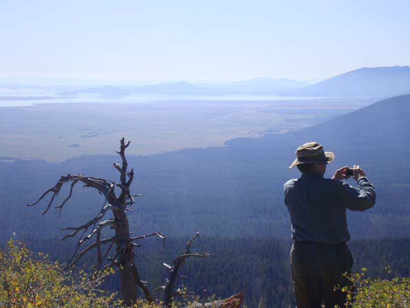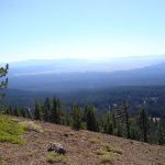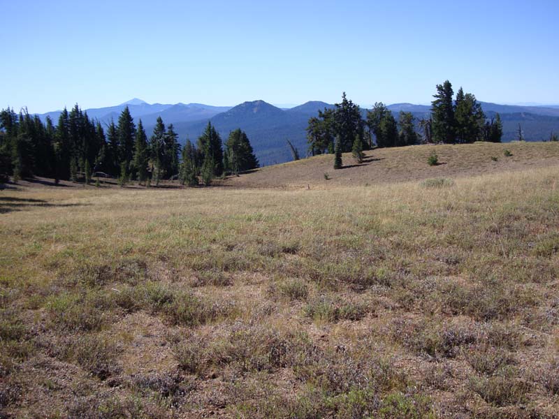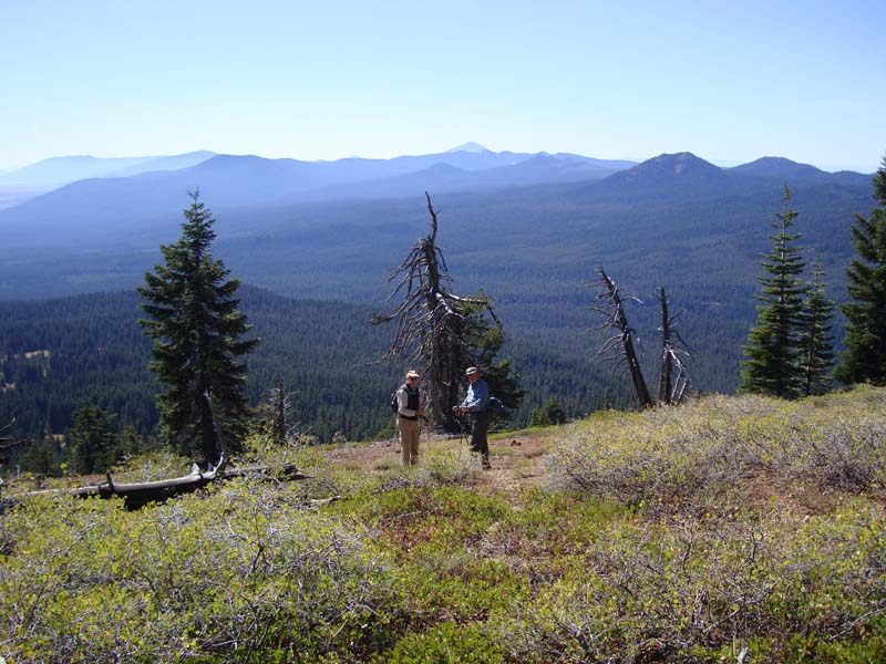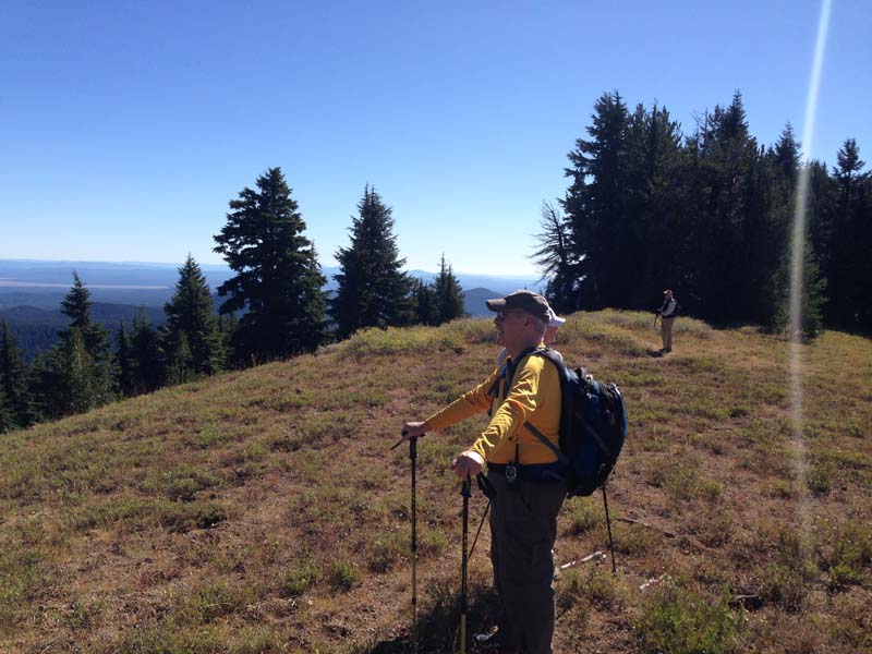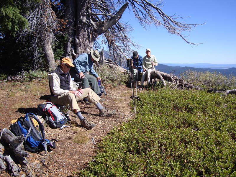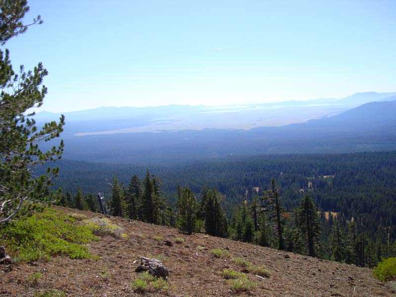 The crater at the summit is a bit underwhelming at less than 1,000′ across. However, the real payoff on this hike is the spectacular view of the Klamath basin from the summit. However, we were only able to enjoy a 1/2 Annie lunch there lazing in the sun looking south towards Klamath Falls before Hank started moving us along again.