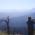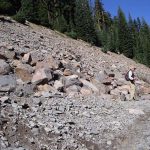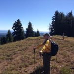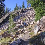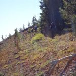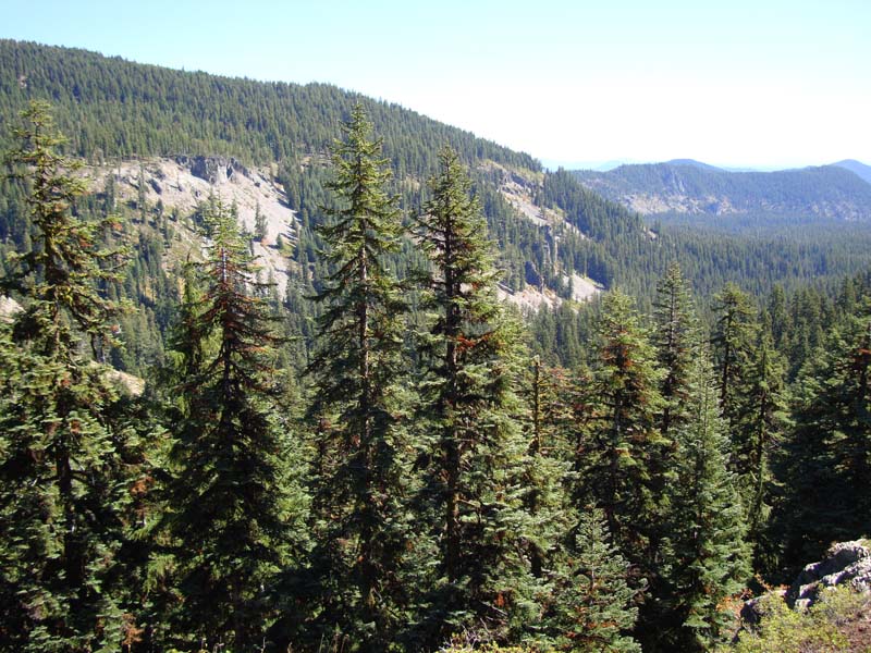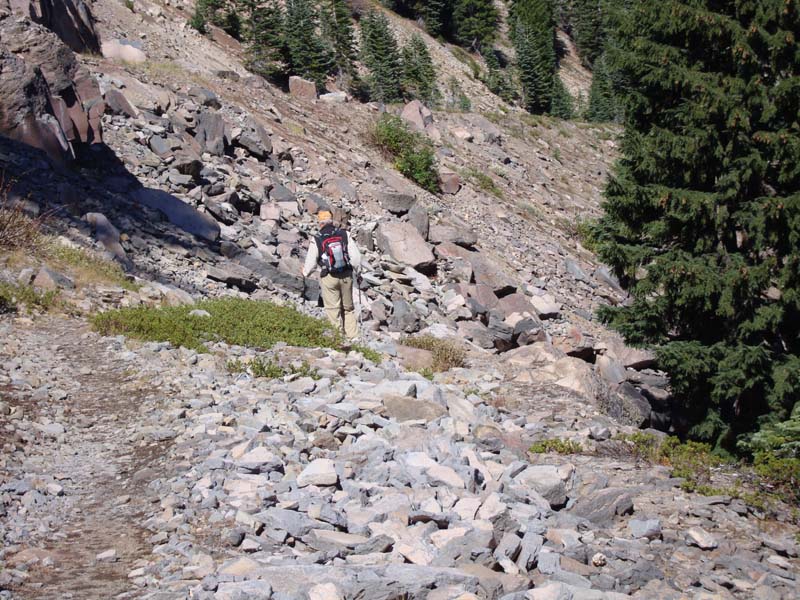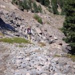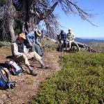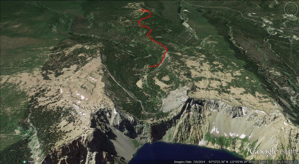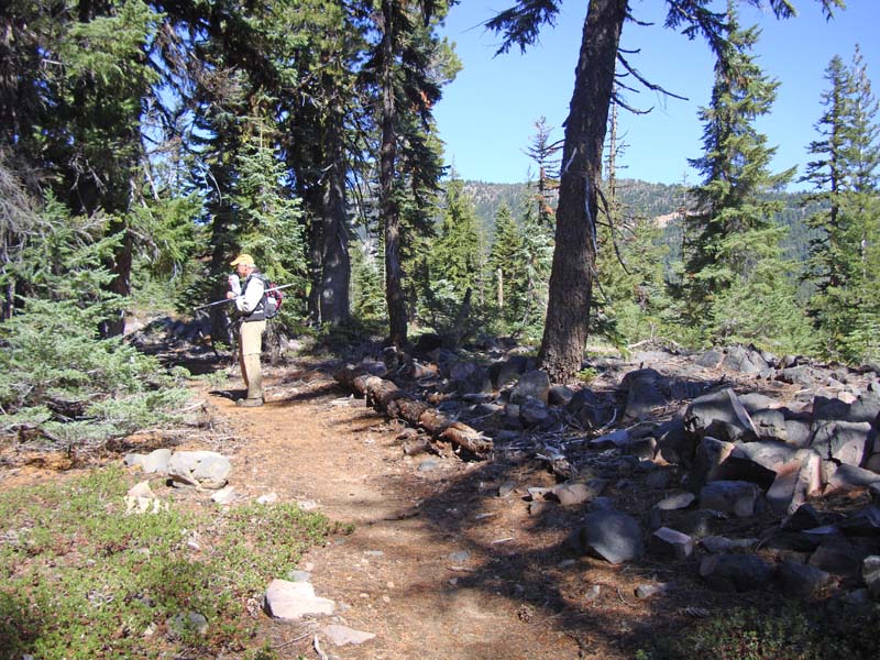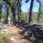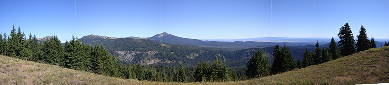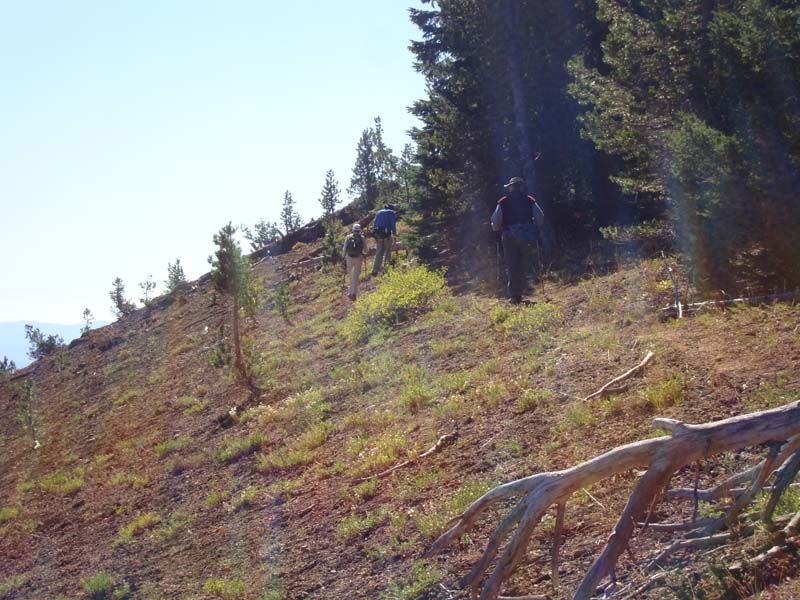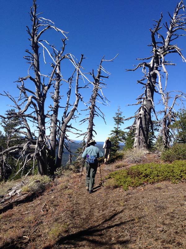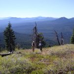 The crater at the summit is a bit underwhelming at less than 1,000′ across. However, the real payoff on this hike is the spectacular view of the Klamath basin from the summit. However, we were only able to enjoy a 1/2 Annie lunch there lazing in the sun looking south towards Klamath Falls before Hank started moving us along again.