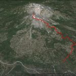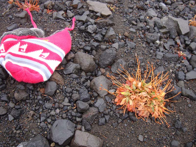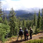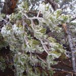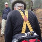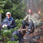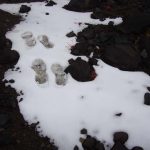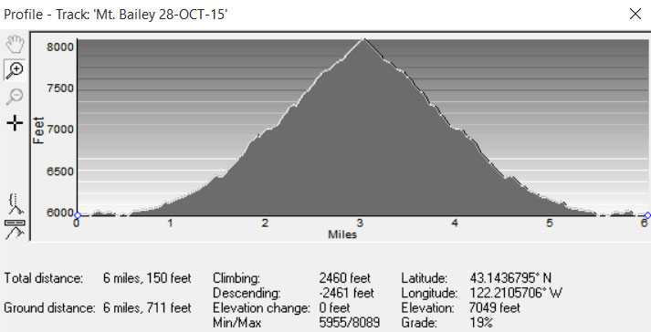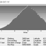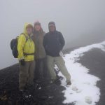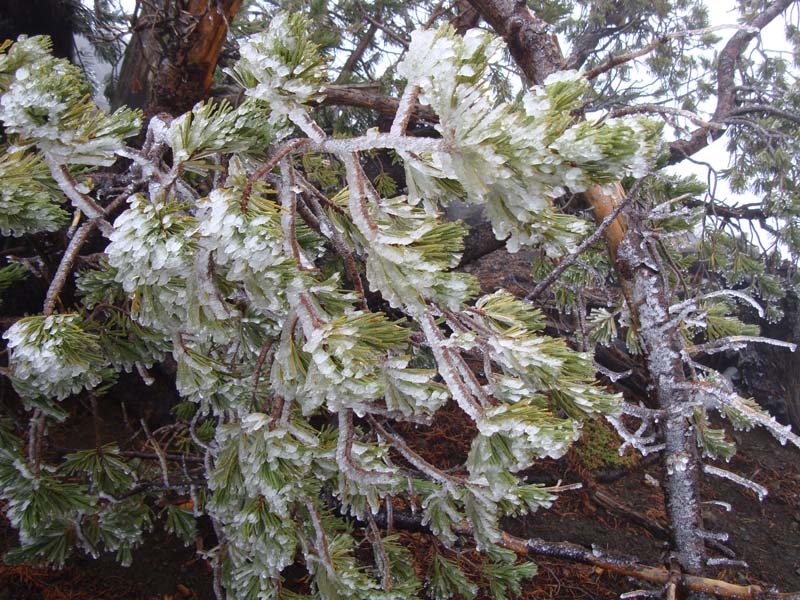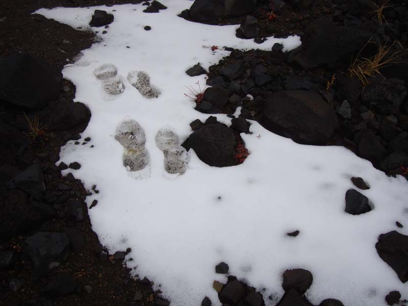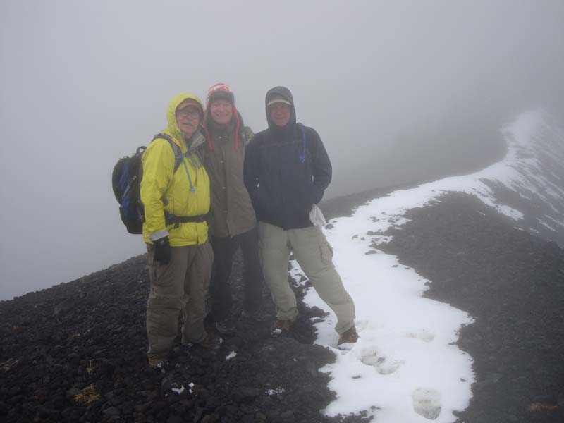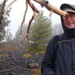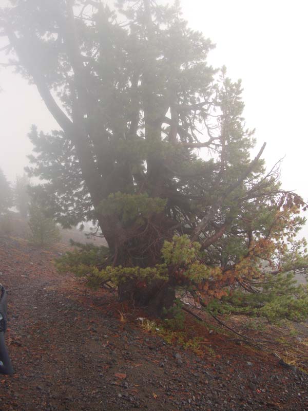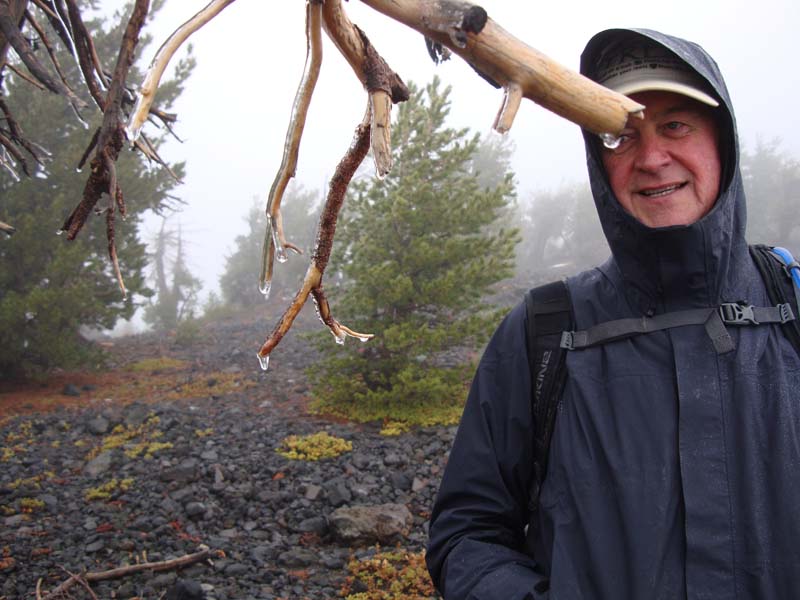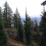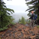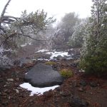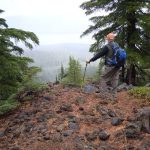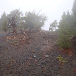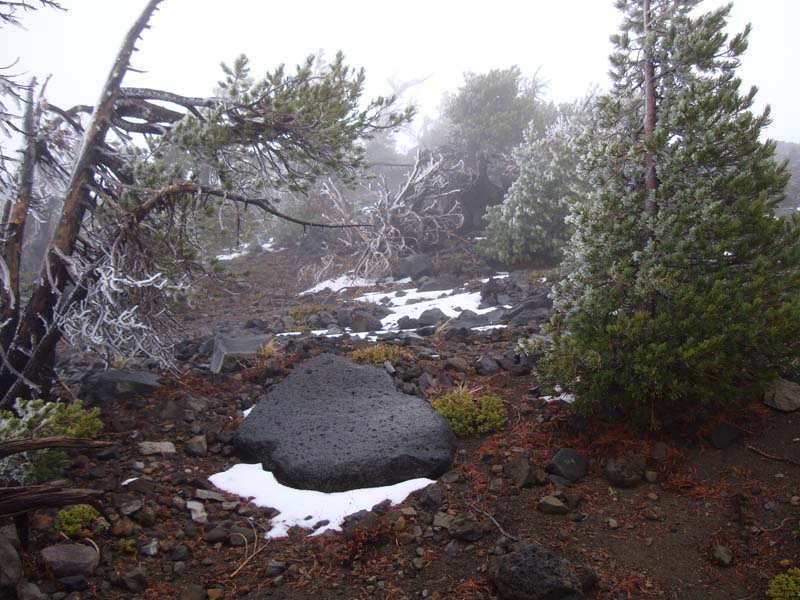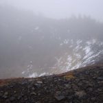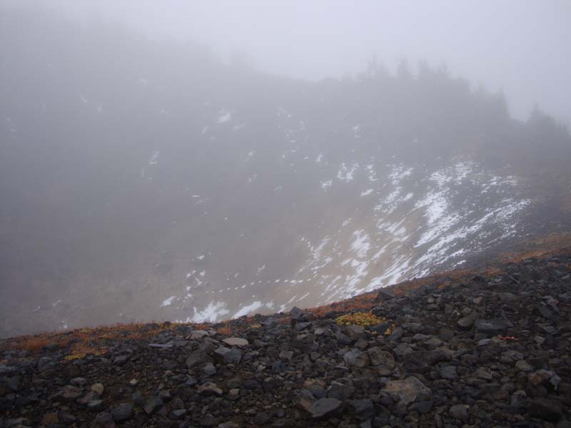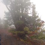 The temperature when we arrived at the trailhead was around 50oF. We enjoyed full sun alternating with overcast in the morning until we entered the clouds at around 7,200′. We had a few minutes of light sleet as we went up, and we crossed some fresh snow patches. We didn’t have any wind to speak of until we came around the boulder at the south end of the saddle to the summit. The temperature here was probably a bit above freezing and that coupled with being in the fog and having the saddle covered with snow convinced us to declare victory here about 300′ shy of the summit and to drop back down for lunch. In any case, as Sabin observed, “we’ve climbed everything we can see”.