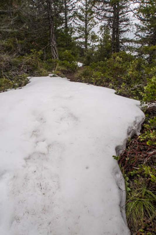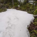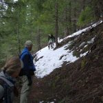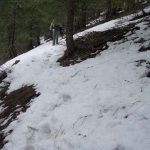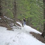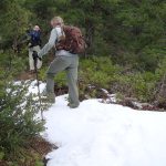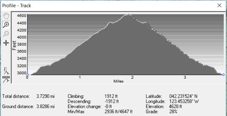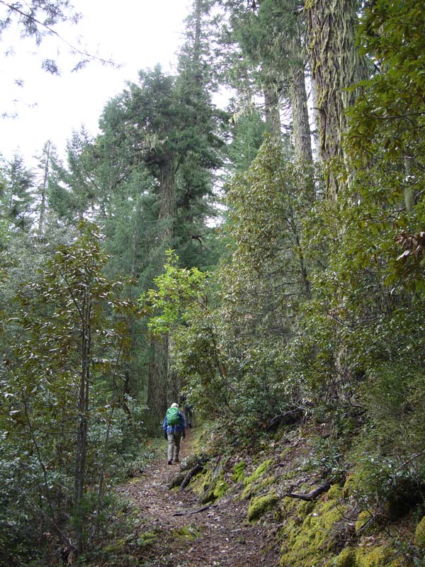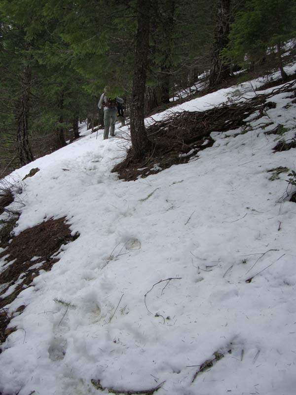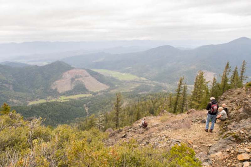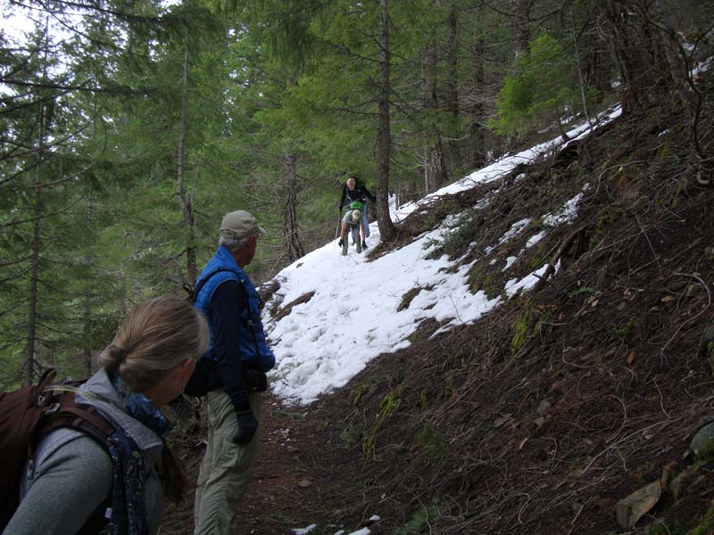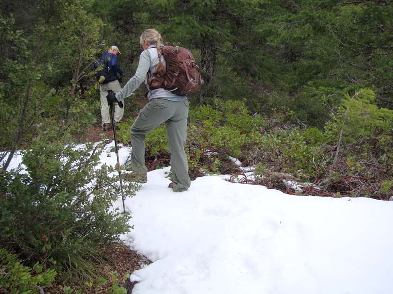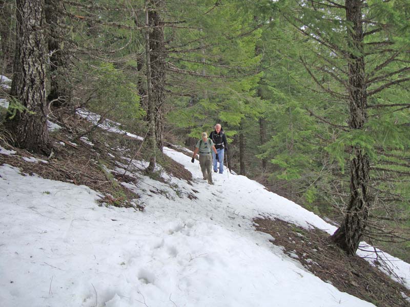 This is a steep, but short hike, with great views of the Illinois Valley. The trail is in good shape and there was a lot of moss on the very large trees. As we passed the 4,200 foot elevation, snow started to appear on the trail. At just below 4,700 feet elevation (over 1,800 feet above our starting point), the trail was completely covered in snow, plus the going was steep and challenging, so we opted to return to a good lookout position and have lunch.