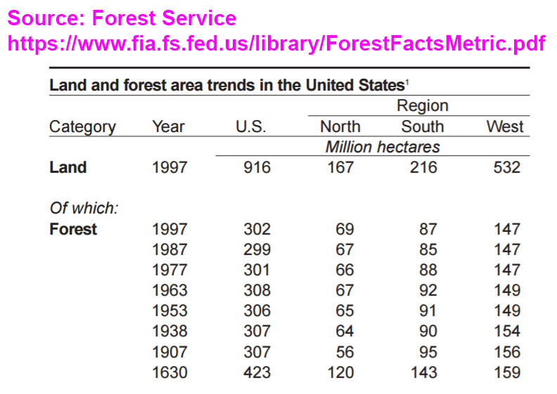 After two centuries of decline, the area of US forestland stabilized in about 1920 and has since increased slightly. Forest area in the U.S. is now about what it was 100 years ago (302 million hectares in 1997 versus 307 in 1907 Source: Forest Service). However, there are more trees today in the United States than there were 100 years ago (Source: NORTH AMERICAN FOREST COMMISSION). Nationally, the average standing wood volume per acre in US forests is about one-third greater today than in 1952; in the East, average volume per acre has almost doubled. Forest growth nationally has exceeded harvest since the 1940s. By 1997 annual forest growth exceeded harvest by 42 percent and the volume of forest growth was 380 percent greater than it had been in 1920.