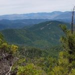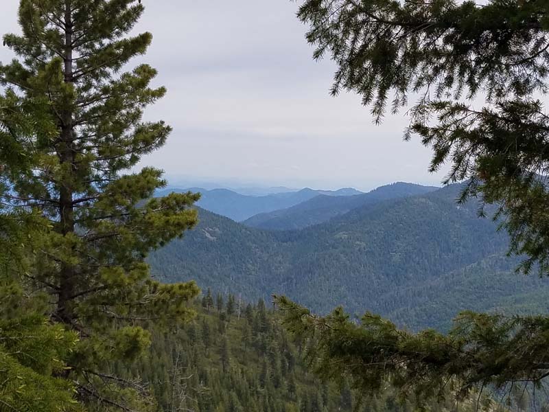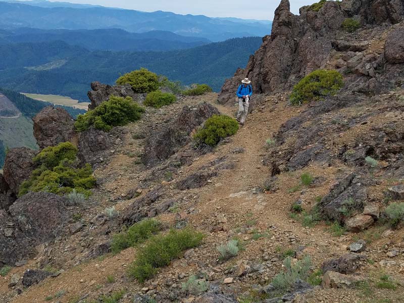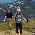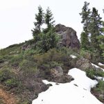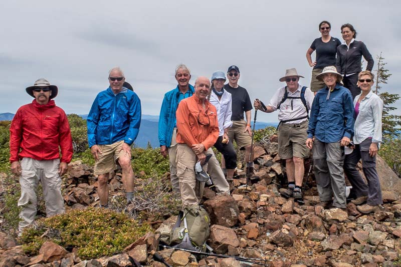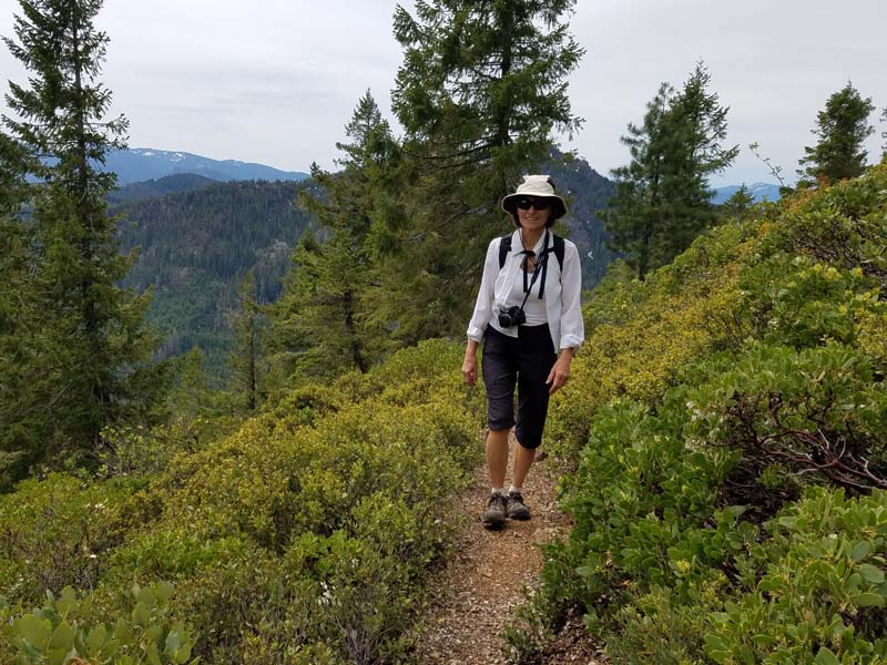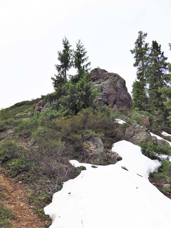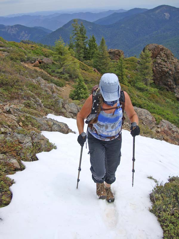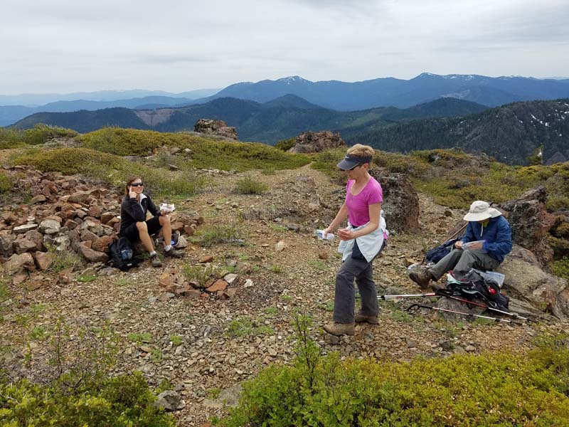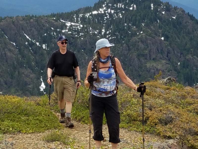 Back to the hike – today started out in the mid 60’s under cloudy skies. This hike climbs 800 feet every mile for 3.5 miles. We started out in the forest, then broke out once on the ridge for a bit, then back in the forest for the remainder of the hike to the top. We did make it to the top this time, unlike our failed attempt due to snow in April. The only snow we found was near the top and there was only 15 feet of hiking on the snow to make the ascent. YEA!