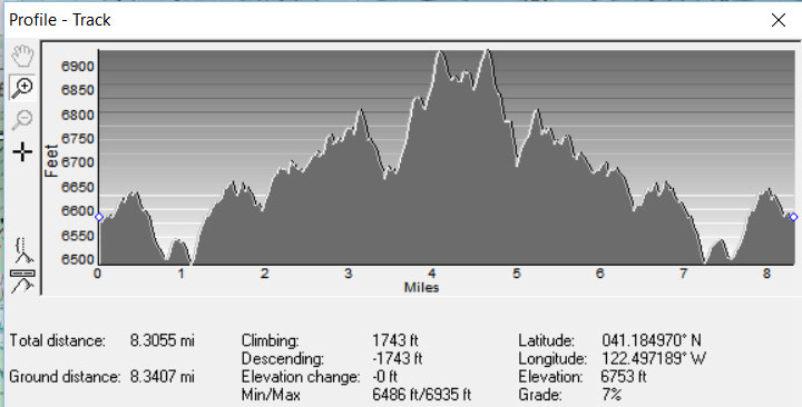 Both hikes were about the same length (8 1/2 to 9 miles) but the Boulder Peak Group 1 had an extra 800’ of down and 800’ of up to bag the summit. Notwithstanding the Hike Mt. Shasta website writeup of the first mile of the PCT south from 40N45 as a not to miss section of the PCT we were quite unimpressed with it.