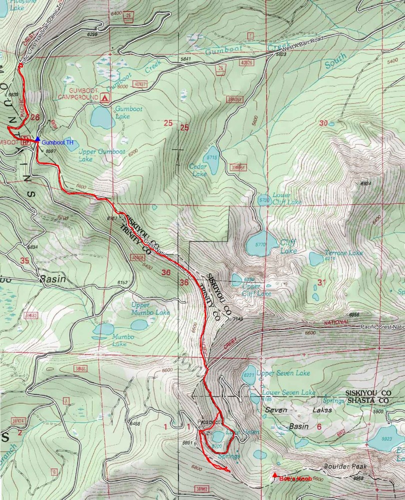 Well, this was an interesting day. Seven of us started out, divided into two groups. Group 1 started at the Gumboot trailhead with a plan to summit Boulder Peak. Group 2 started at the 40N45 trailhead, about a mile further north of Group 1, with a plan to summit Bob’s Knob. Both groups shared the same trails for the middle portion of their hikes but the Boulder Peak group continued on about one mile further south to summit Boulder Peak.