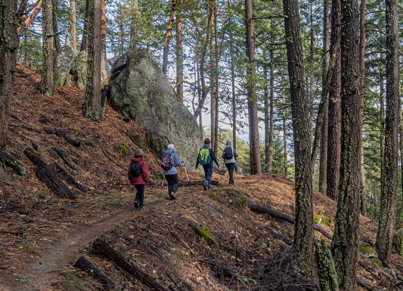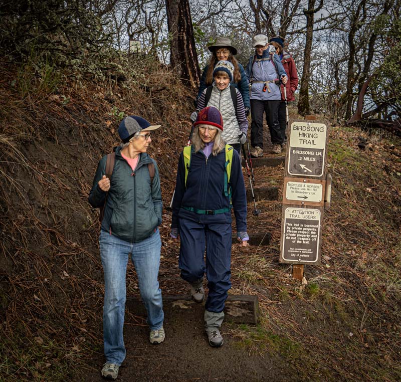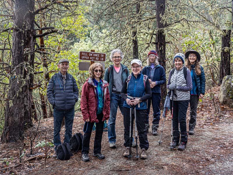 We started on the short Birdsong Trail past our favorite very old and weathered Manzanita Tree. We continued right on the Hitt Road Trail to the second sign for the Fell On Knee Trail. Rosalie led this hike in her very popular Hike-It OLLI class. In that class we learned from one of the guys who worked on the trail that the name comes from the word ‘felony’ as the trail might have gone through some private lands (I don’t really know).