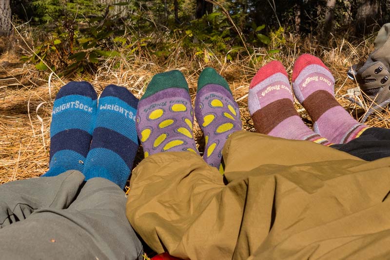 Lunch was a delightful event, all sitting around an open meadow area. There was a view of Mt. McLoughlin and Mt. Bailey from a nearby spot. Several happy hikers took their shoes off. See if you can identify the owners of the socks in the picture below.