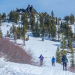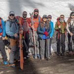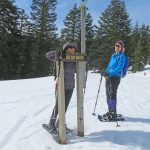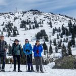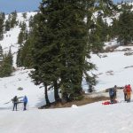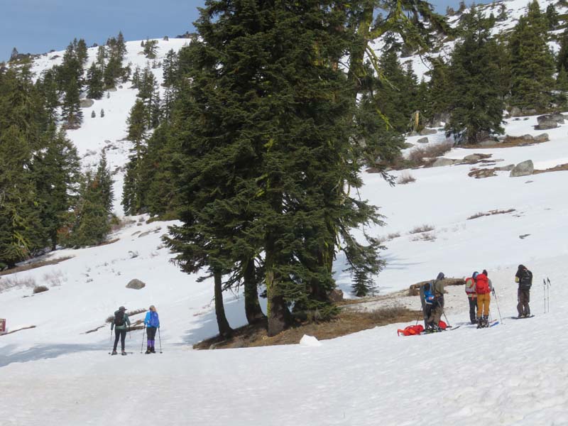 Encountering students and faculty of the SOU Outdoor Adventure Leadership (OAL) program was the highlight for us all. Upon arrival to park and register at the new white-box station, we found three SOU vans and three small groups of faculty and students organizing for a field day to learn avalanche survival and rescue skills. They greeted us warmly and were delighted to tell us about the program. We took pictures of them to share with Professor Chad Thatcher for use in their program. We joined one of the three groups for a photo to post on our website.