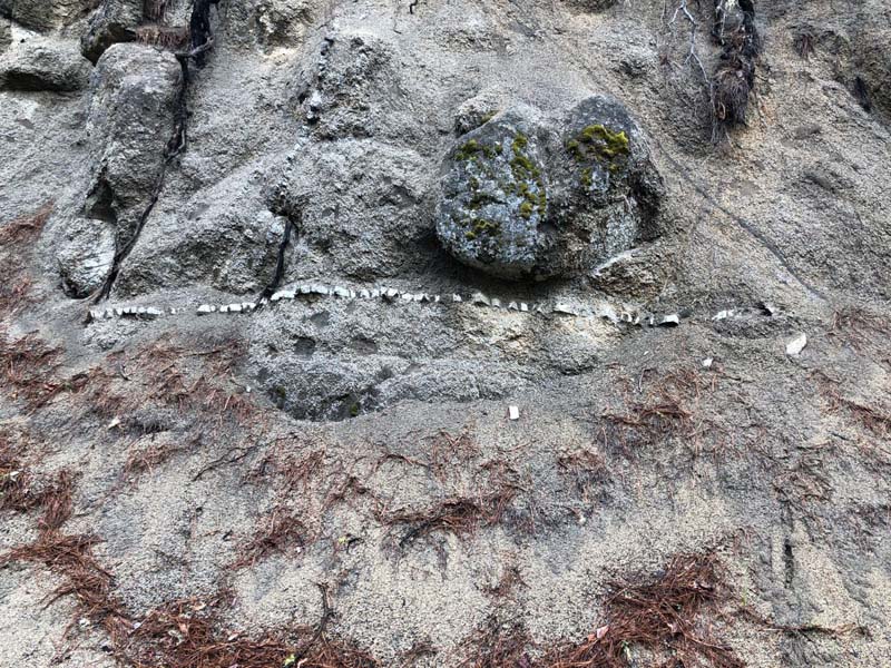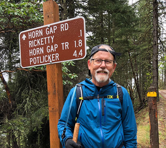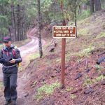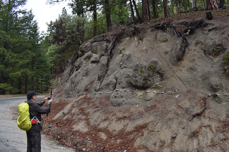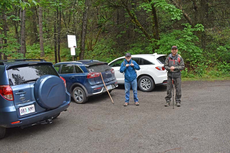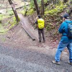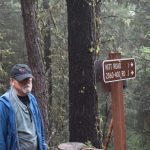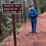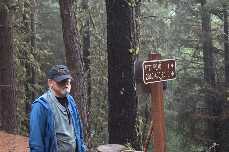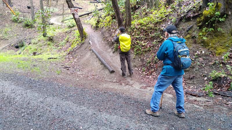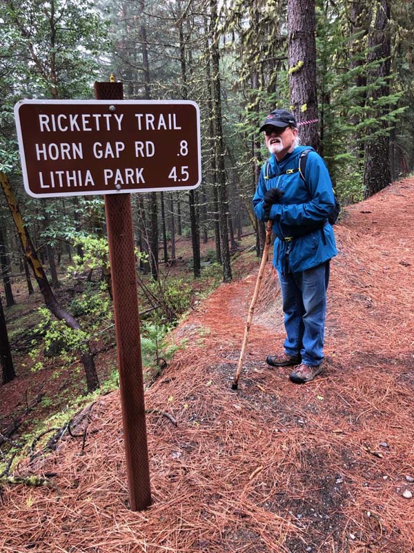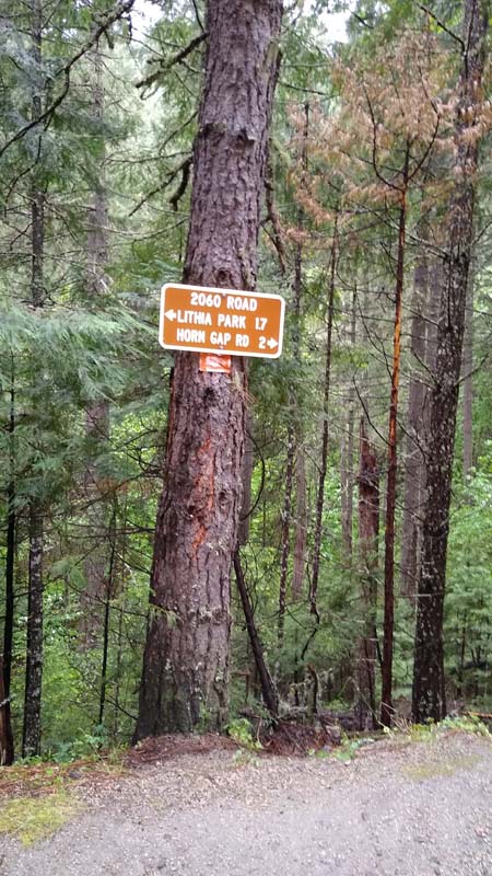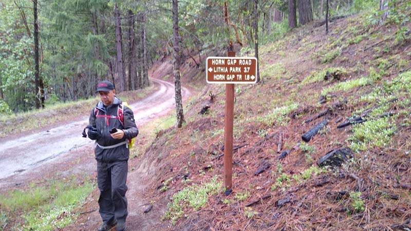 Through intermittent showers, we kept heading up in search of Horn Gap Road. Finally, at 3.7 miles from Lithia Park we saw FS 2060 turn off to the right and ahead of us was Horn Gap Road! Not flattened out as described in a Mail Tribune article but still heading up. So after a brief discussion we decided to get off the road and take the Rikkety Trail foot path 0.8 of a mile up and over a steep hill and back to 2060.
