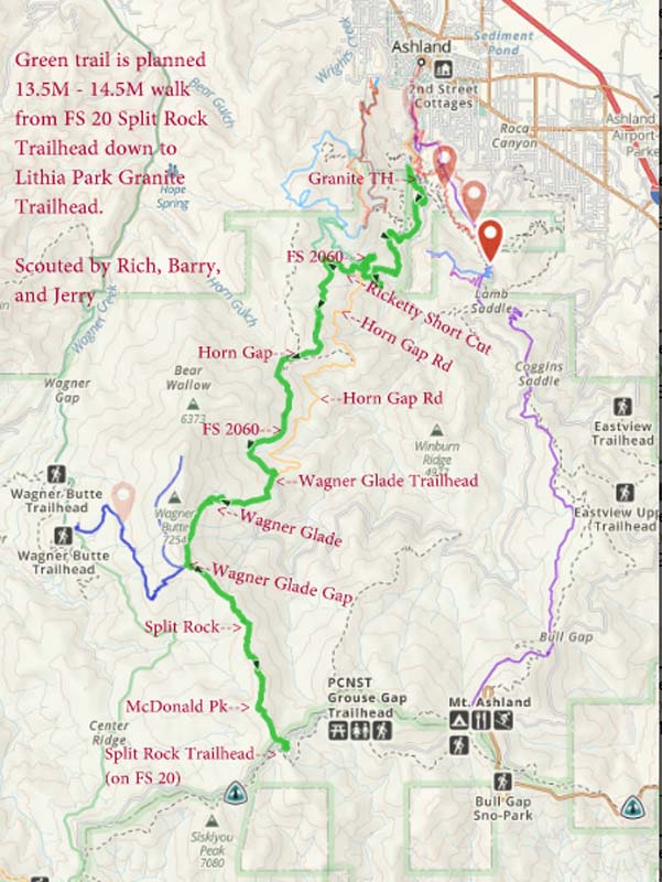 We had an early start Monday morning as we were heading up into the Ashland Watershed for parts unknown. Jerry, Barry and myself met at the top of Lithia Park at 8 am to go scout out the elusive Horn Gap Road. I had made a couple of previous solo attempts to find it and had asked both hikers and bikers I met along the way, but with no luck.