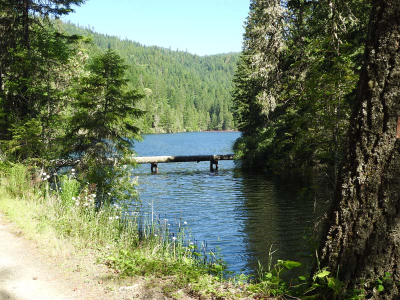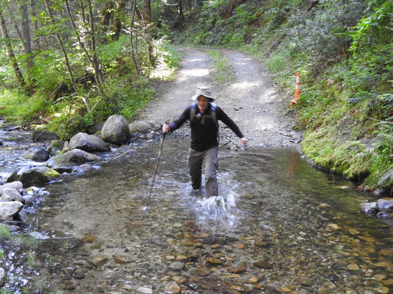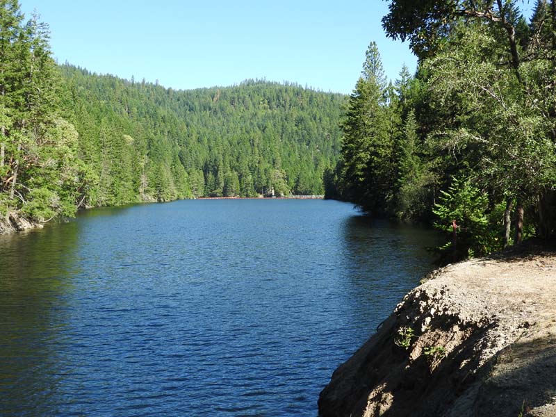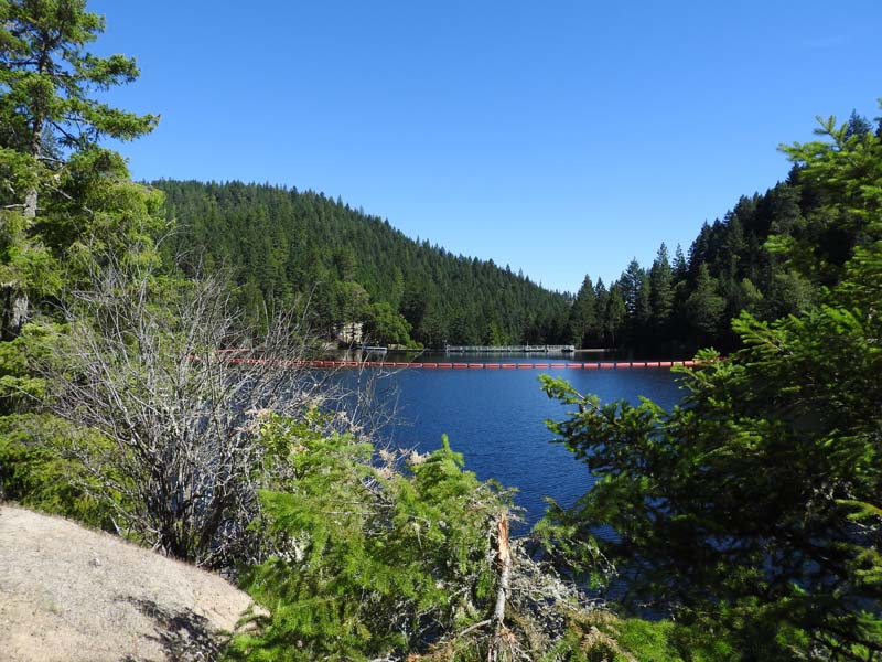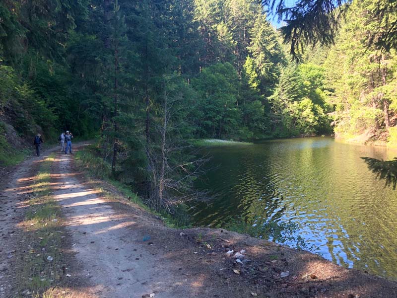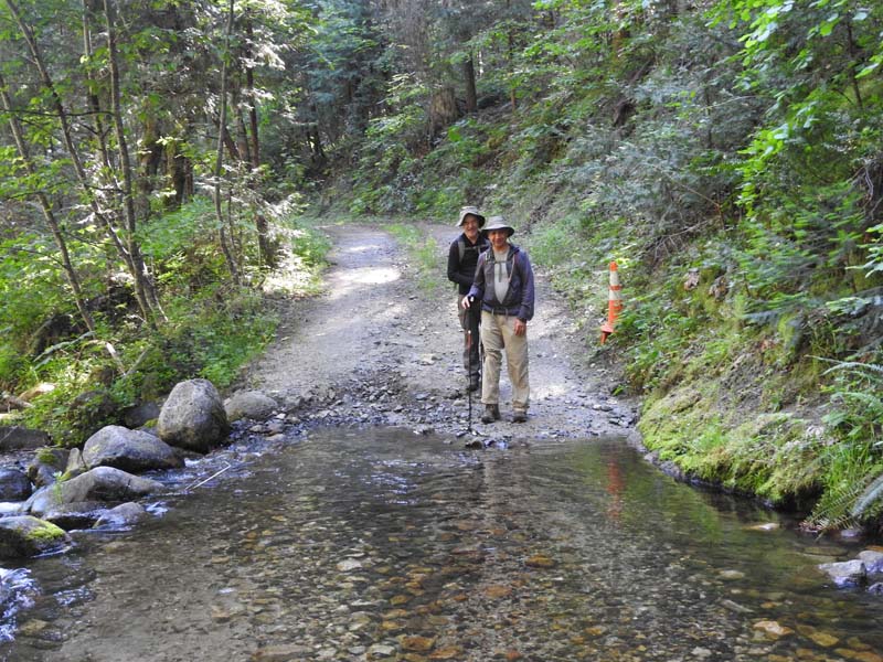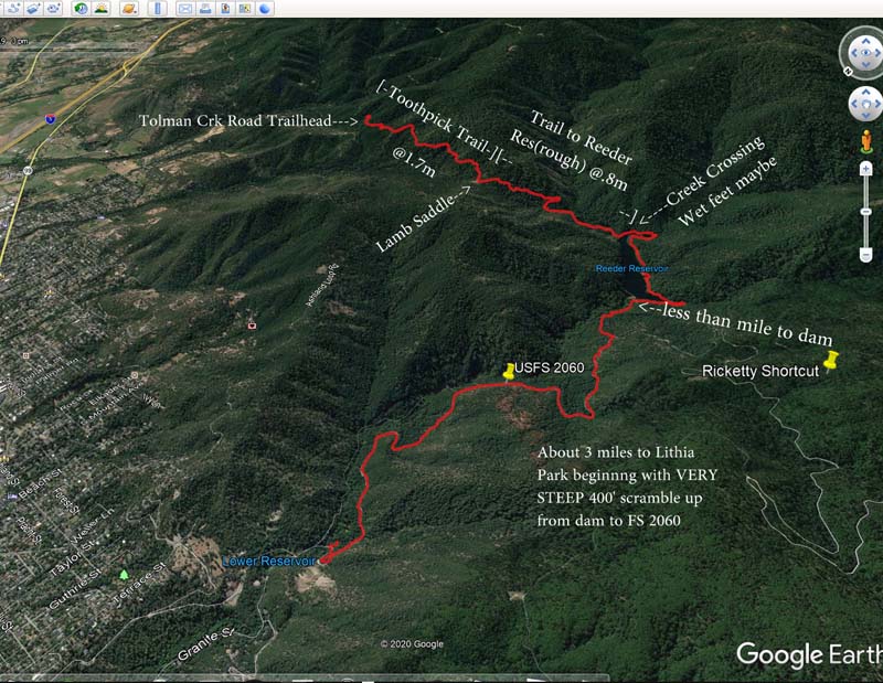 Suddenly the East Fork of Ashland Creek came roaring into the lake perhaps from an underground spring. We were full of wonder and awe as we took the old service road around a side of the reservoir. At one point we had to walk through about six inches of water from a tributary creek running over the road. Jerry surprised us when he decided to venture up a rough trail off the road that went up 400′ to FS2060 which he took three miles back to Lithia Park.