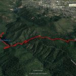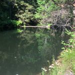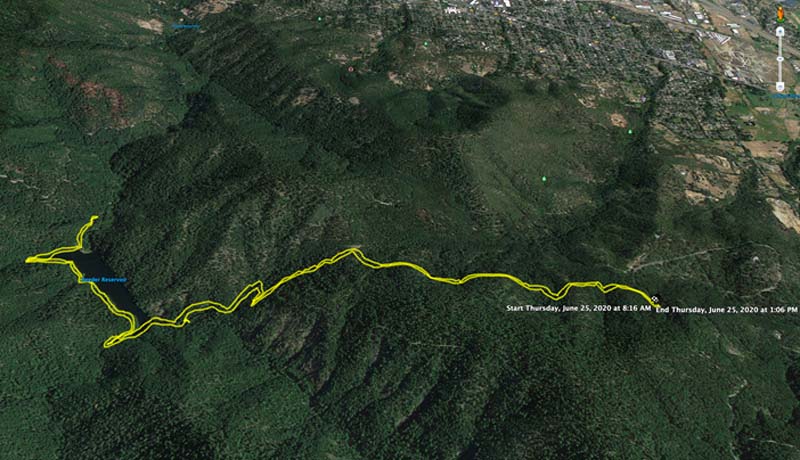 Jerry’s track app showed an old unnamed route heading down to Reeder Reservoir behind the sign boards at the Saddle. But we had no idea of the condition of the old trail (we brought our work gloves). But we were surprised and pleased when Jeff shouted out “Hey it looks like there’s a trail down here!” And the trail was in good shape for the 0.8 mile 600′ decent down to the reservoir. Although narrow at times with more than a dozen deadfall trees across the path.