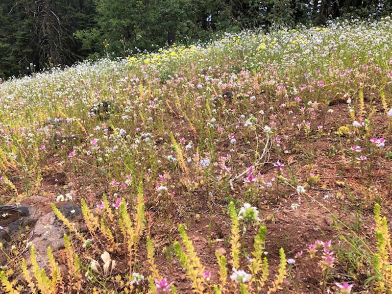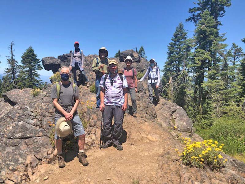 On a sunny Wednesday morning, Mary, Sunny, Darryl, Sabin, Rich and newcomer Collette and I headed up the “back way” through Emmigrant Creek valley below Highway 66 and up Baldy Creek Road to Boccard Point where it intersects with the PCT towards Pilot Rock.