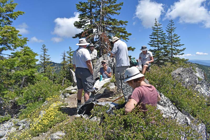 We met many local and some through hikers on the trail out to Siskiyou Peak, including former regulars Gary Swanson and Ron and Claudia Little. John Kerr broadcast on our radios that he was waiting for us up on the peak. He had taken the short route from Grouse Gap out to Siskiyou Peak and was reading a book as he awaited our arrival. He had met through hike hiker Chris on the trail and offered her a lift into Ashland when we met her again as we were leaving Callahan’s.