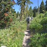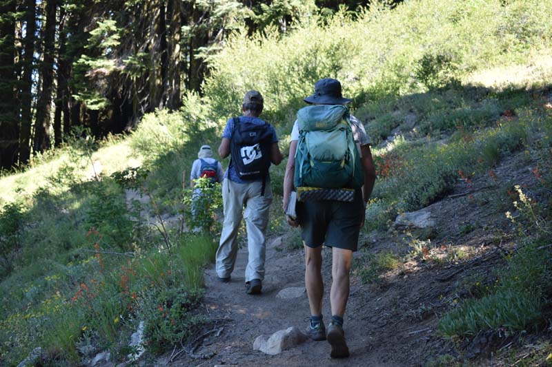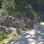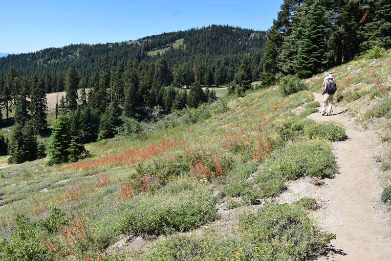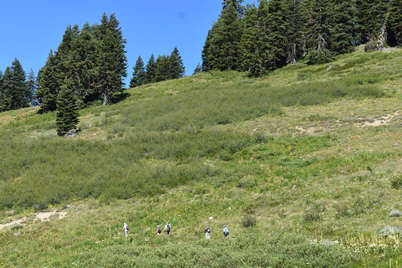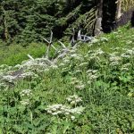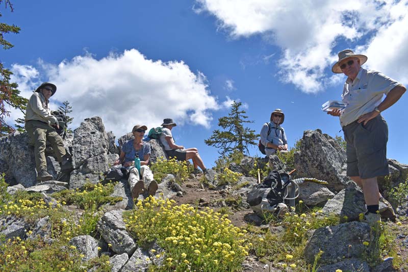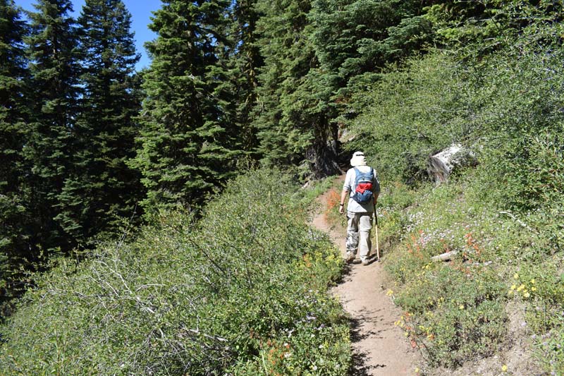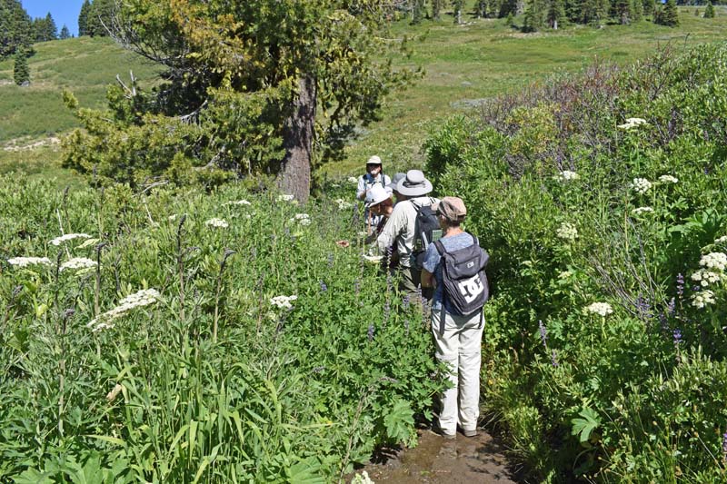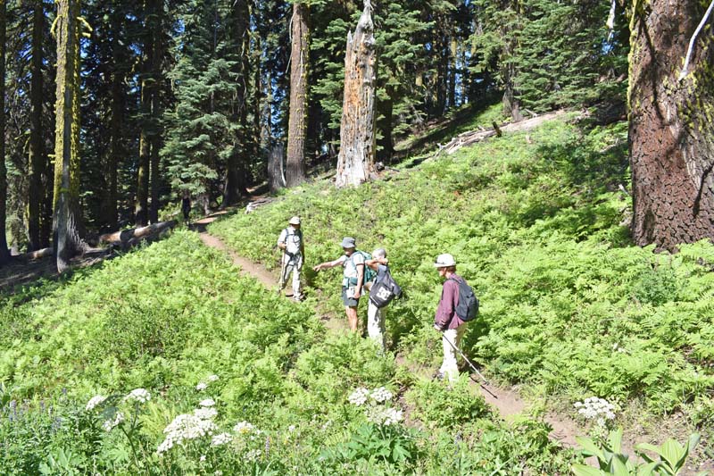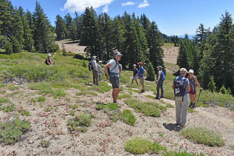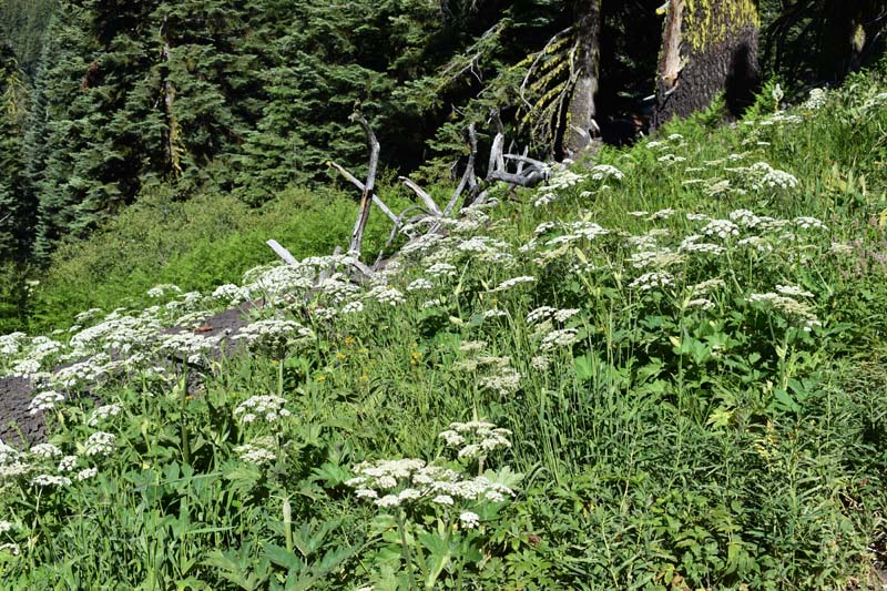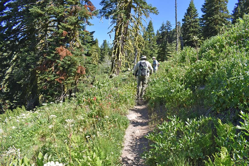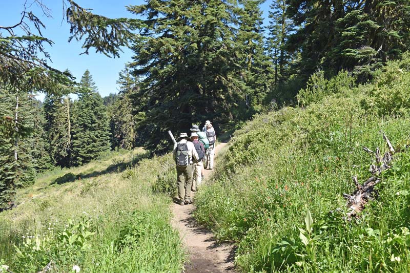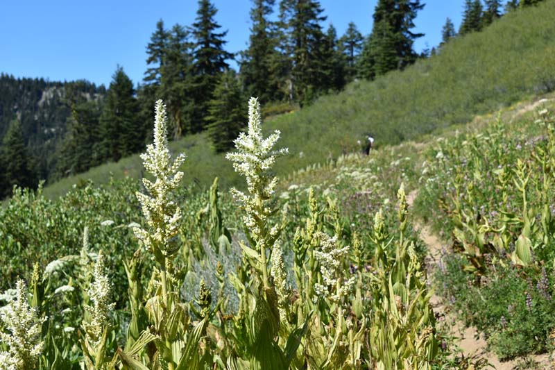 Our small group of hearty hikers started on the PCT where it crosses the lower service road a half mile below the ski area parking lot. The added miles allowed us to view the jam-packed natural gardens of wildflowers out to Grouse Gap. Featured beauties included the purple trio of Lupines, Monk’s Hood and Tower Delphiniums, many over 6′ high; and the white multiple blooms of the tall Corn Lily. Many small creeks were busy irrigating the meadows.