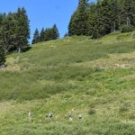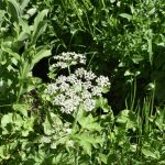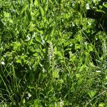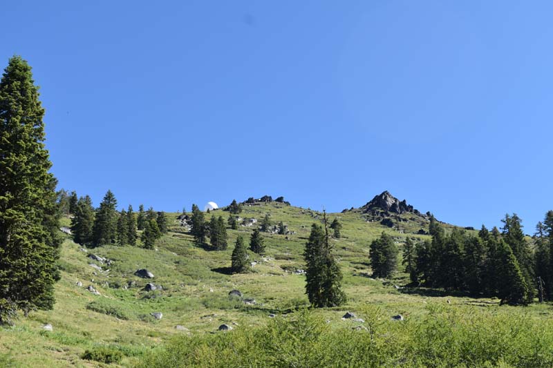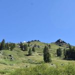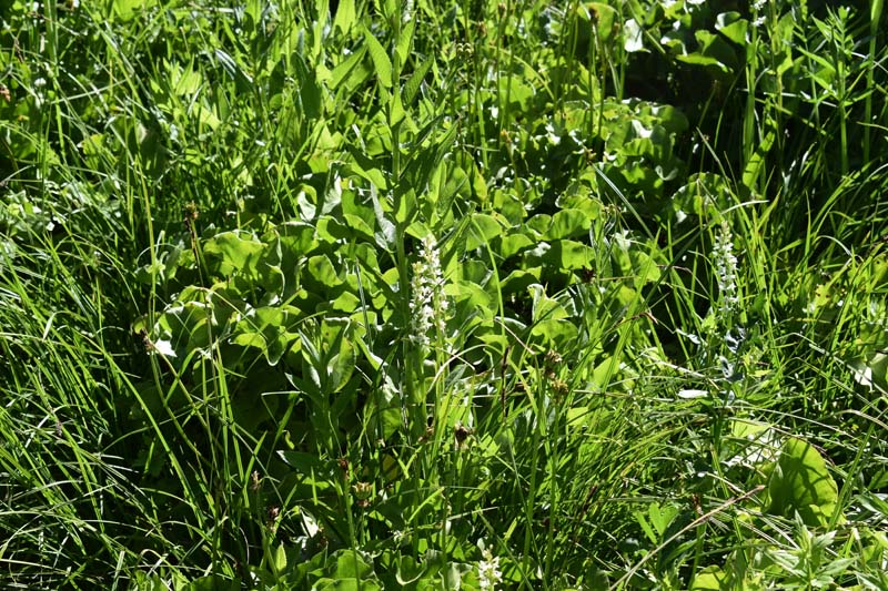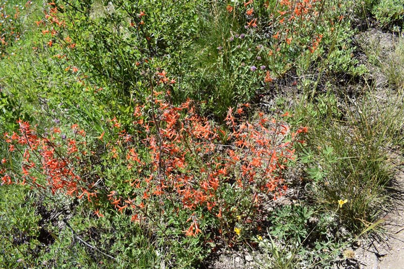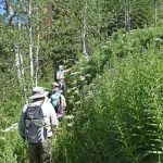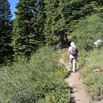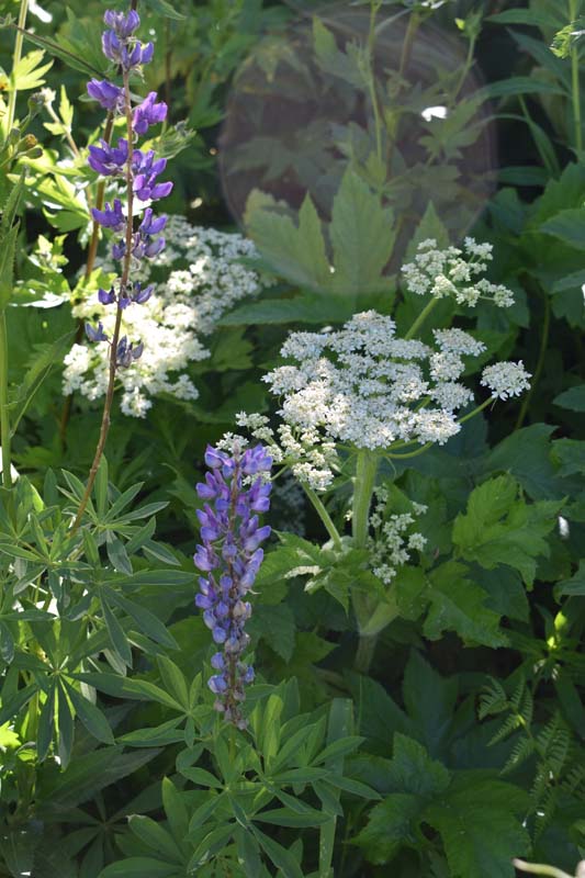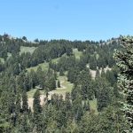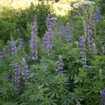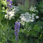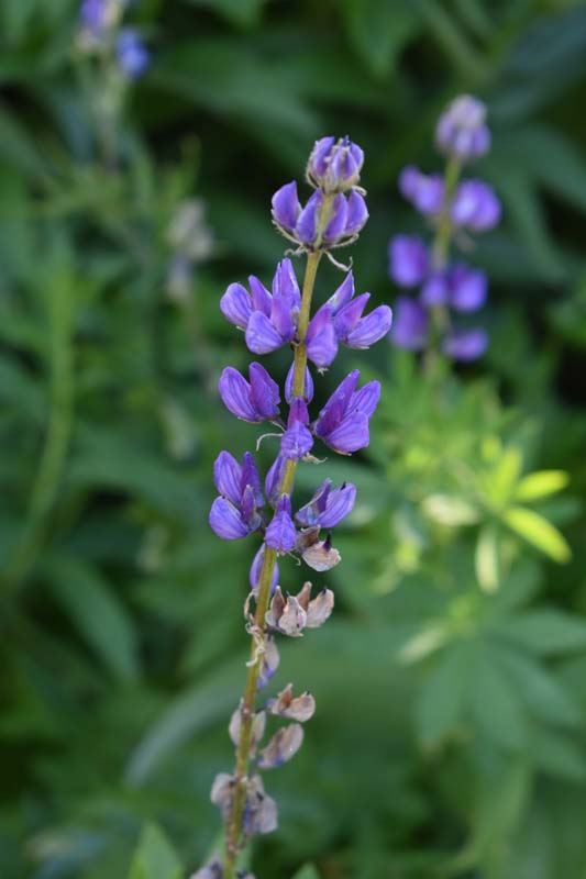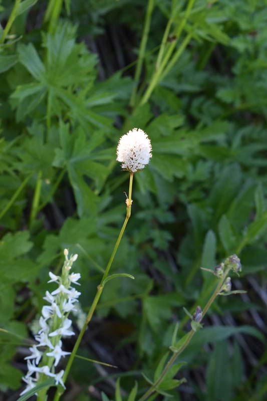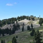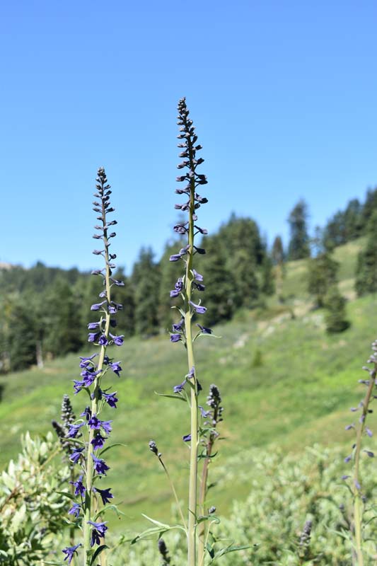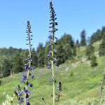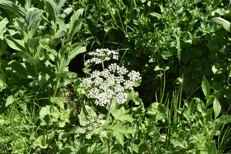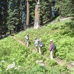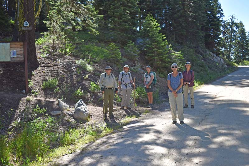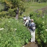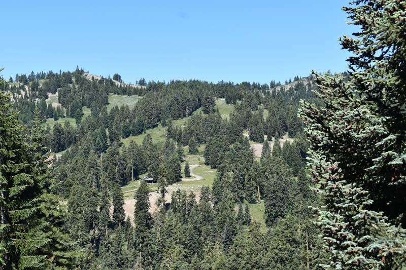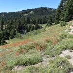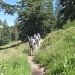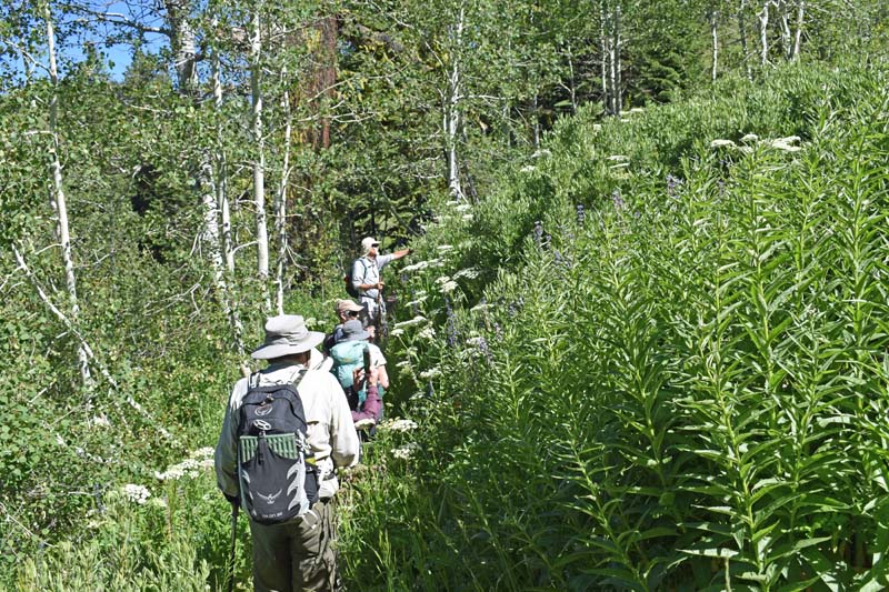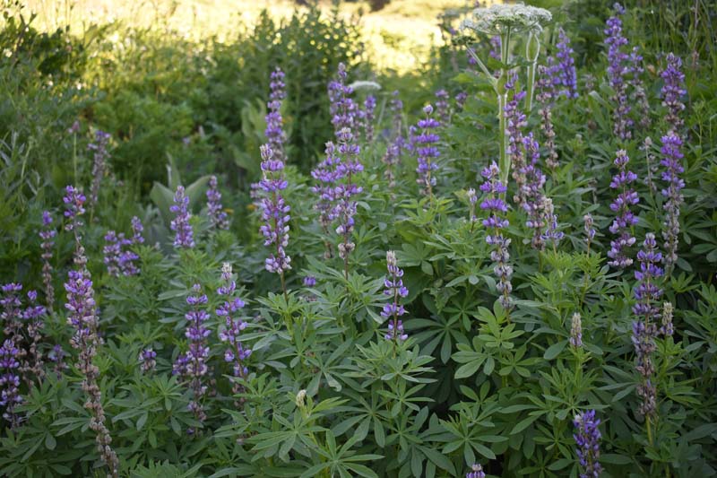 Our small group of hearty hikers started on the PCT where it crosses the lower service road a half mile below the ski area parking lot. The added miles allowed us to view the jam-packed natural gardens of wildflowers out to Grouse Gap. Featured beauties included the purple trio of Lupines, Monk’s Hood and Tower Delphiniums, many over 6′ high; and the white multiple blooms of the tall Corn Lily. Many small creeks were busy irrigating the meadows.