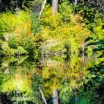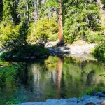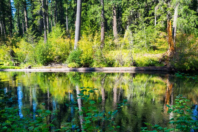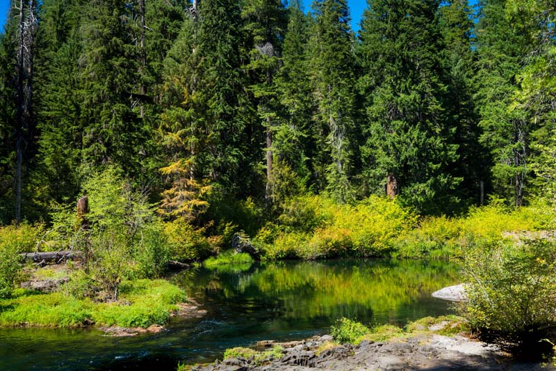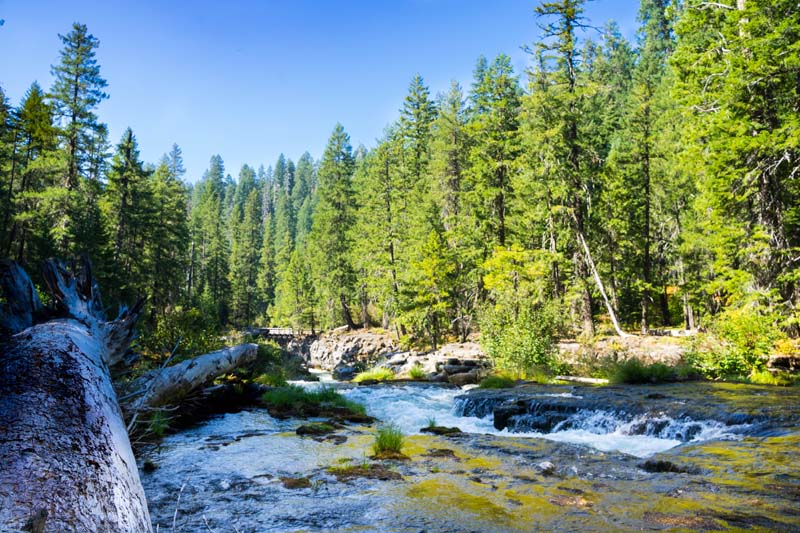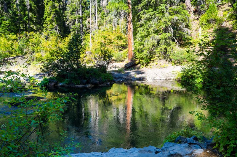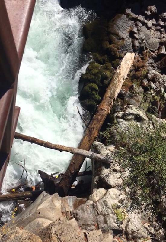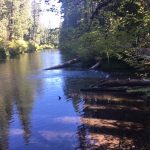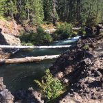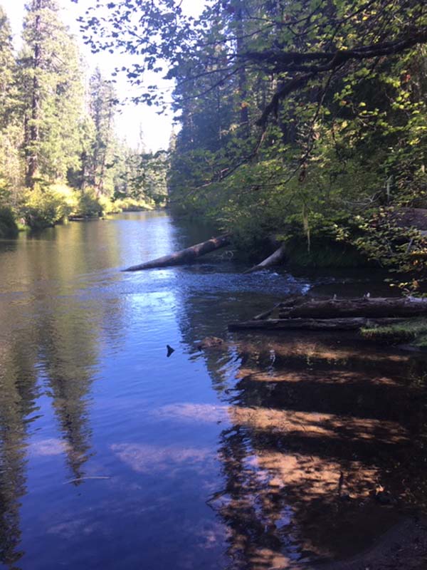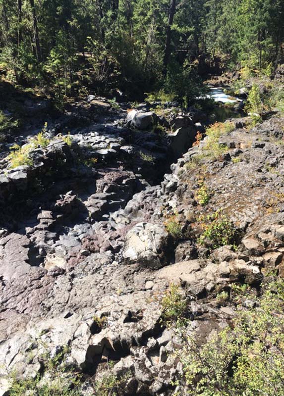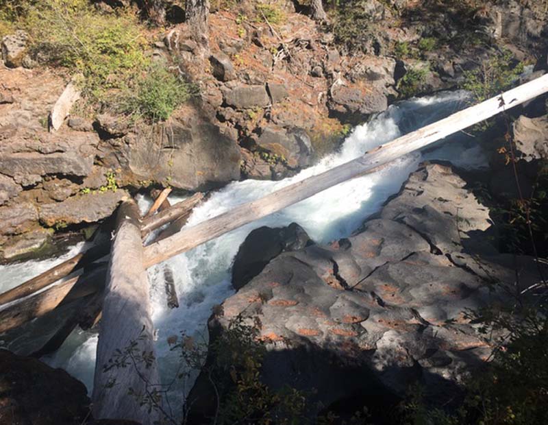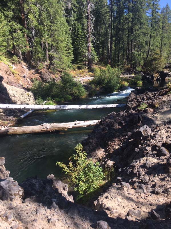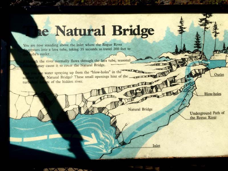 John and Darryl found the path on the posted map and off we went on an untested path. Though a bit rocky at first it turned into a gentle and shaded trail that took us along the Rogue and around a peninsula to Union Creek on the other side. Then we crossed a bridge and headed downstream to the end of Union Creek and continued down the Rogue to the Natural Bridge viewing area. It was 4 miles down and 4 miles back. We had lunch on a long fallen log off the path at the Natural Bridge.