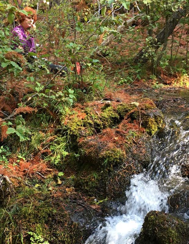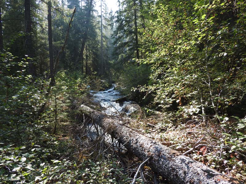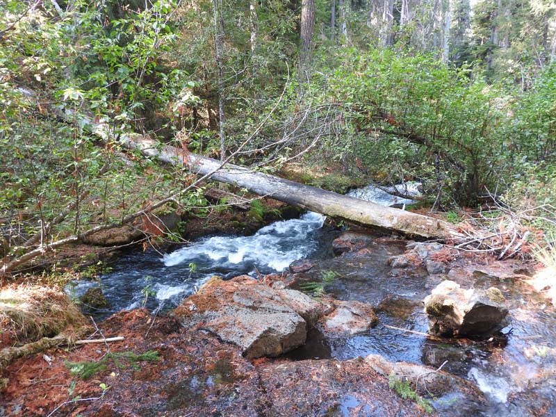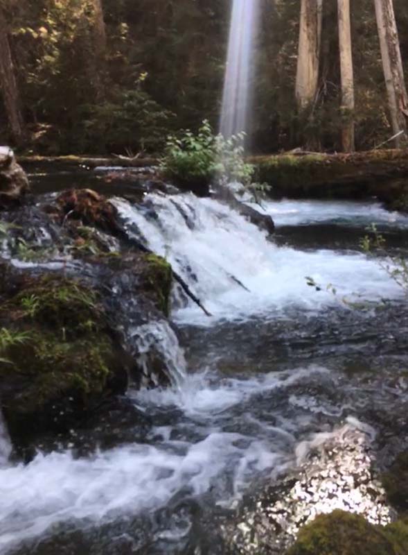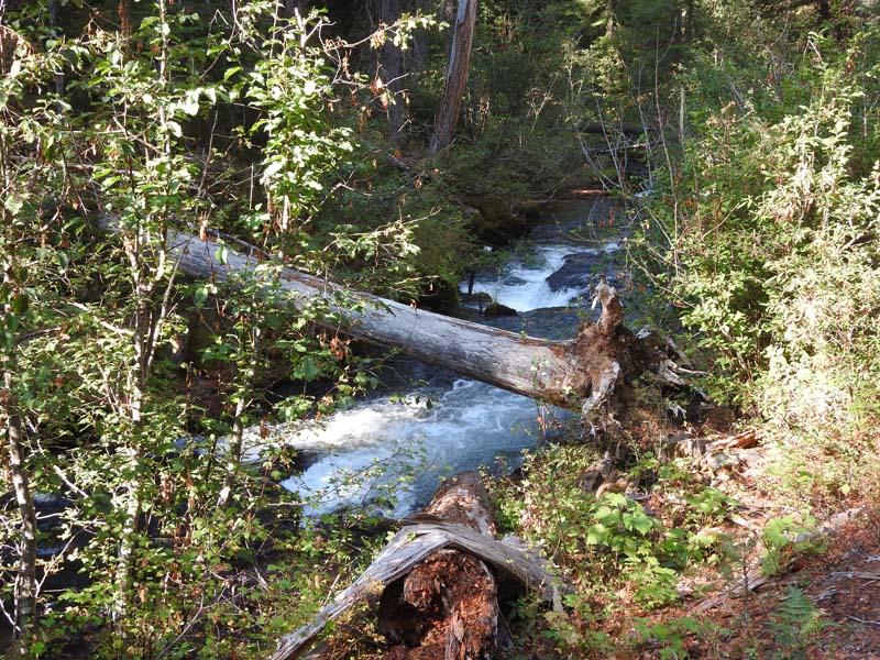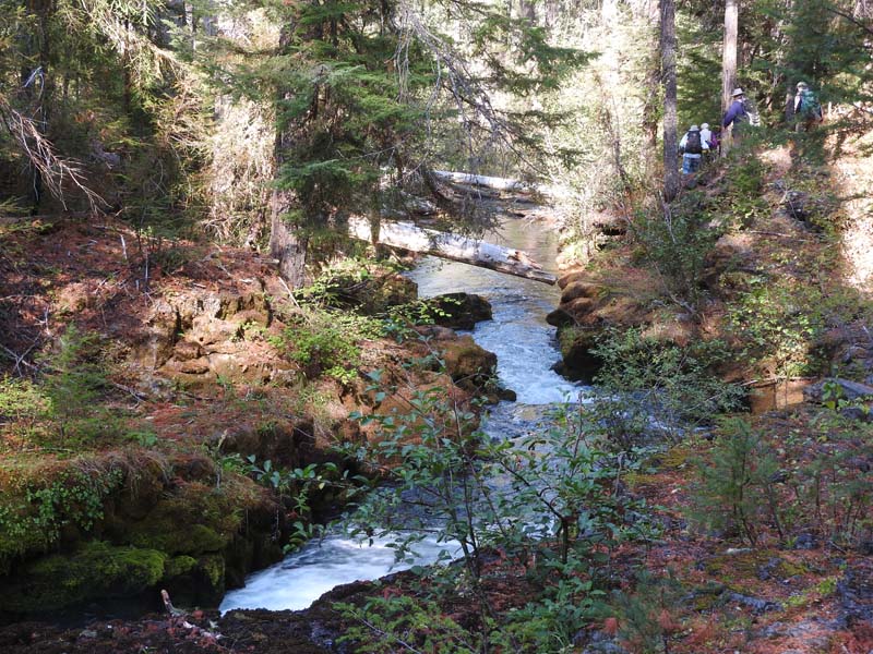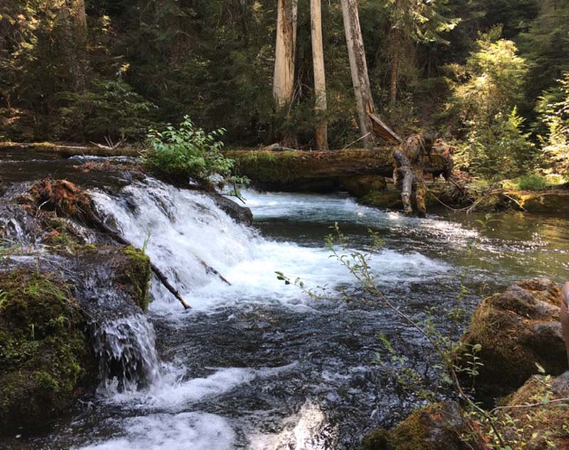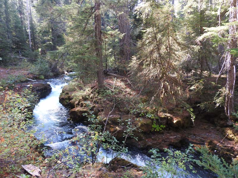 We drove down the level gravel road to a circular parking area and quickly found the trail sign for Union Creek Trail No.1035 (0.8 miles to Union Creek Falls ). We walked through the forest and down to the creek. The stair step falls drop about 4 feet and go all the way across the creek. We decided to follow the path down along the creek for about one hour then return to the falls for a noon time lunch.