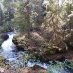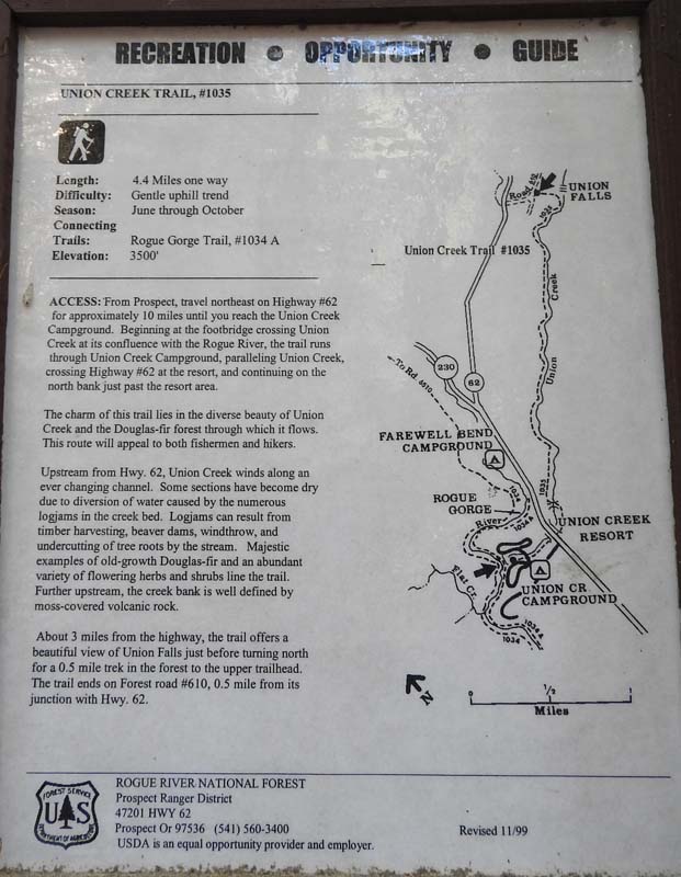 A hiking blogger at vanmarmot.org posted a helpful report about hiking the Upper Union Creek in 2018 complete with pictures of the scenic creek and falls. He and his wife headed up the creek, past the resort cabins but ran into major deadfall obstructions about one mile up the trail. So I thought why not try driving up 62 a few more miles to where the road turns right towards Crater Lake and take that first right where the road sign says Union Creek Trail (FS 610).