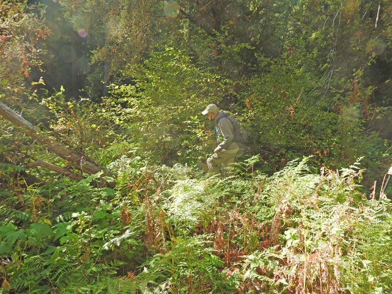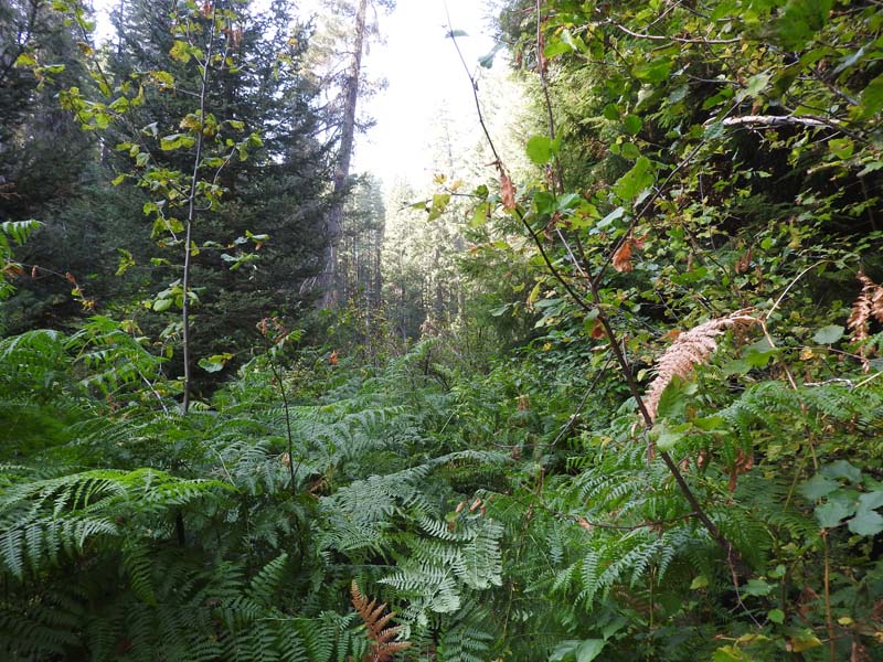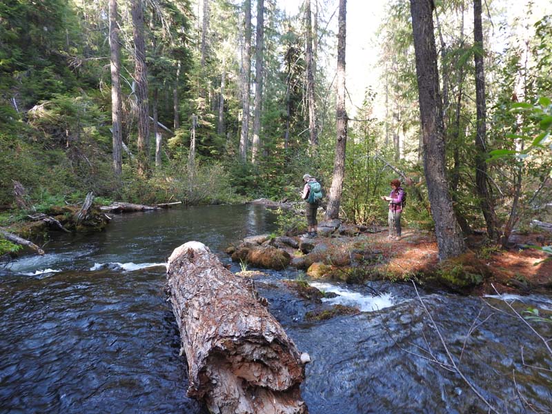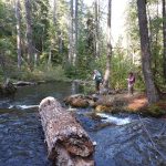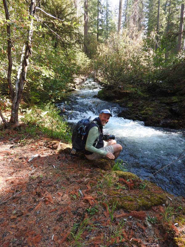 The creek was like a miniature version of the Upper Rogue River, constantly changing from white water rapids squeezing through narrow channels and over many stair step falls to quiet calm waters with gentle pools that attracted the fishermen in our group. This stretch of Union Creek travels down through Old Growth Forests with soft trails and then right next to the creek with giant ferns where only our heads could poke out to see where we were going.