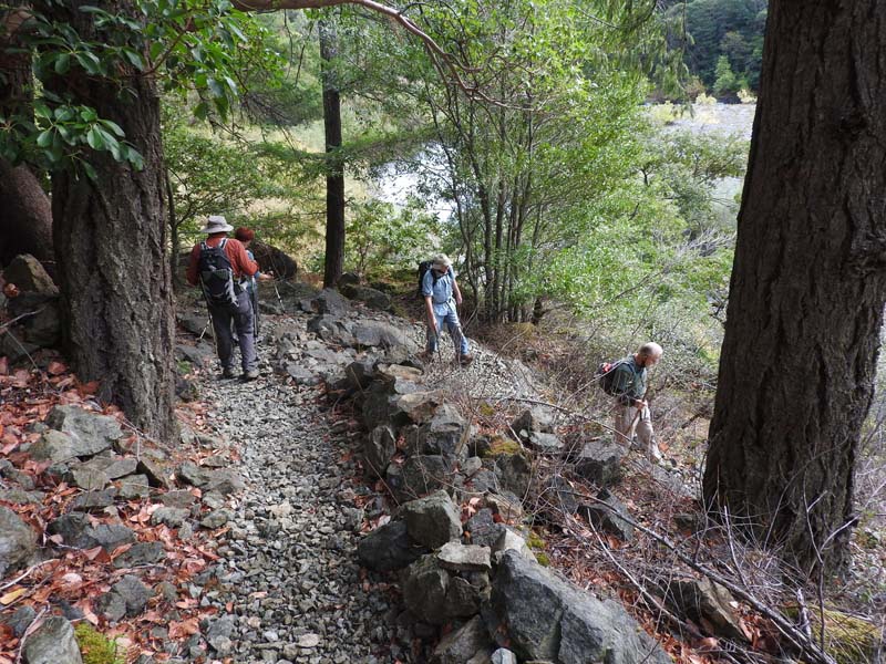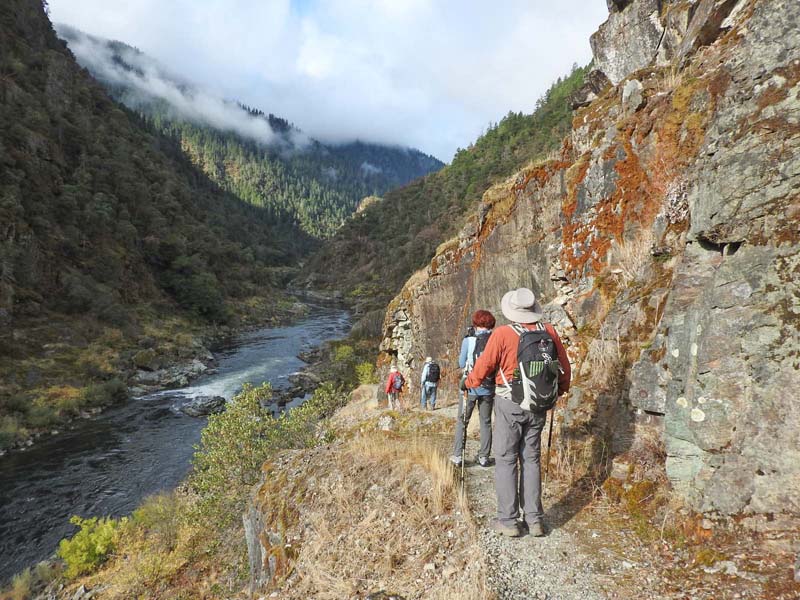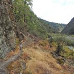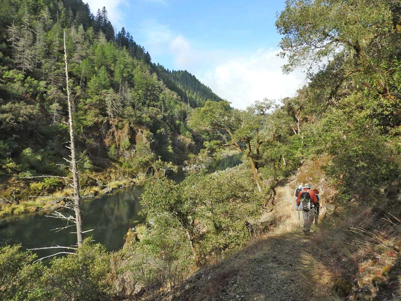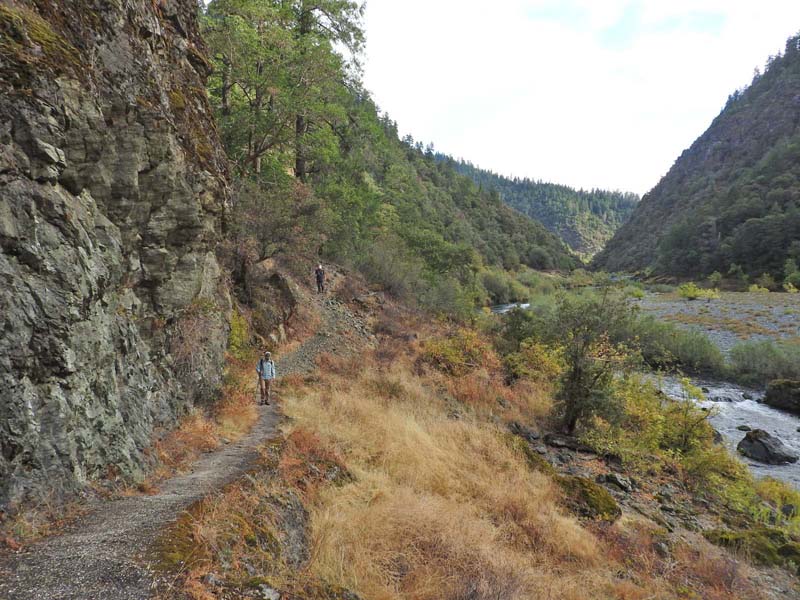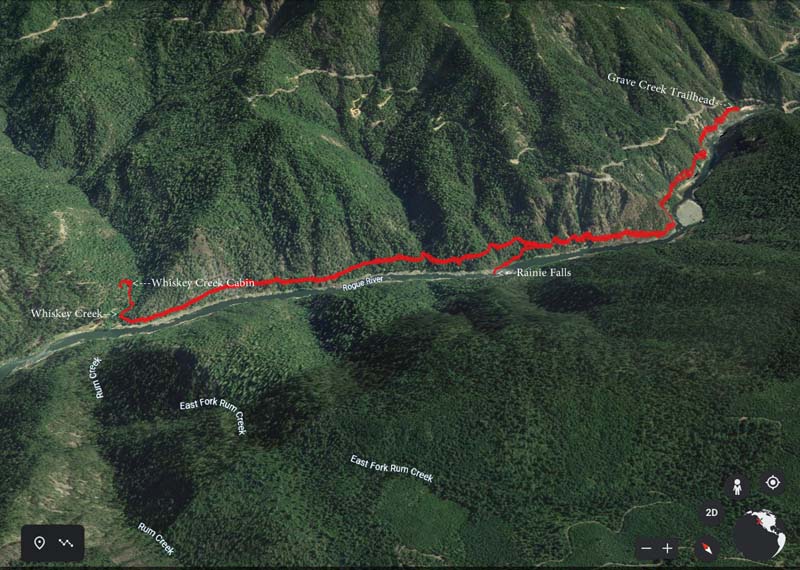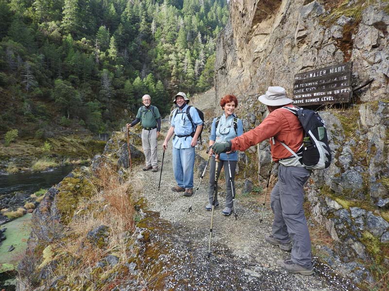 The hike is seven miles out to Whiskey Creek and back with 1,270 feet of elevation gain because of lots of ups and downs above the river. We stopped at the sign which marked the December 23, 1964 flood on the Rogue River that washed away 12 bridges. The river rose 55 feet up to the trail and spread some 300 feet across the canyon. Hard to even imagine!