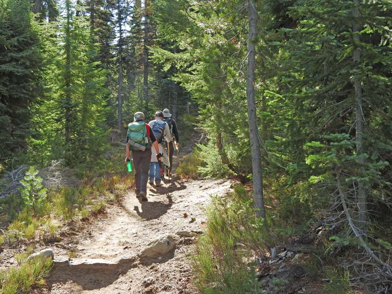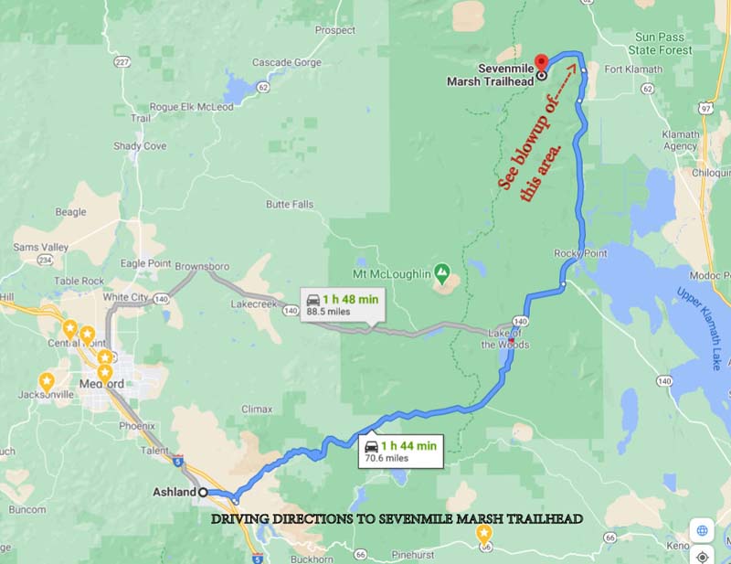 The objectives of this scouting hike were a) to find a less punishing way to access the Seven Lakes Basin and b) to check out the alternatives for visiting the lakes. The drive is 71 miles each way and 1 hour 20- 1 hour 30, depending on speed driven. With the help of an Oregon Atlas we found a preferred way to access the TH. Instead of exiting the West Side Road at 16.8 miles, we continued a mile or so to Hackler Road, turned left, and then left again at Nicholson Road and straight to FR 3334 which goes 6 miles to the TH. This way we avoided 3 miles of gravel road in exchange for 4 miles of paved highway.