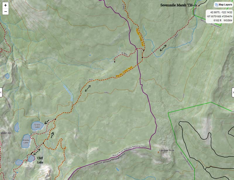 In all we did 11 miles and the only thing we would change is we would have lunch at Cliff Lake. We succeeded in finding a more hiker friendly way of accessing the area than the rock strewn Seven Lakes Trail. A thoroughly fun day and we concluded the area is worth at least 2 hikes a year, one from Seven Lakes TH to the PCT and Shale Butte for lunch, and one doing the Basin loop as we did today. Hardier souls could climb Devils Peak from Sevenmile Marsh but that is a 15 mile day. Keep in mind as well that Devil’s Peak is only 200 feet higher than the PCT near Shale Butte.