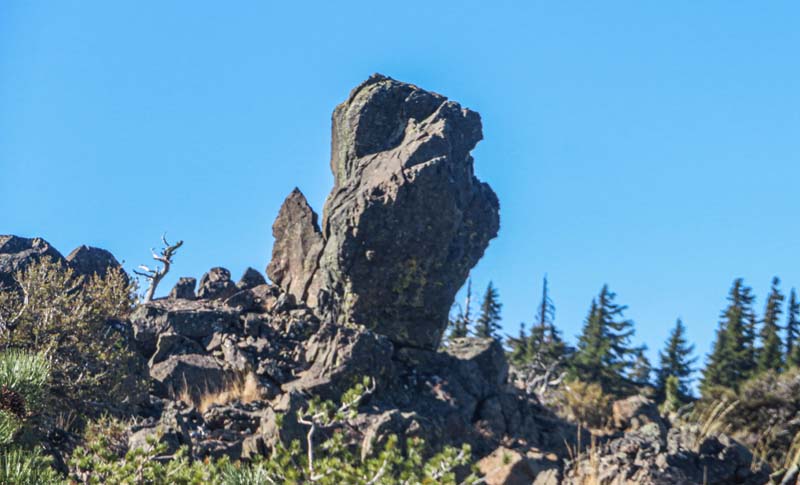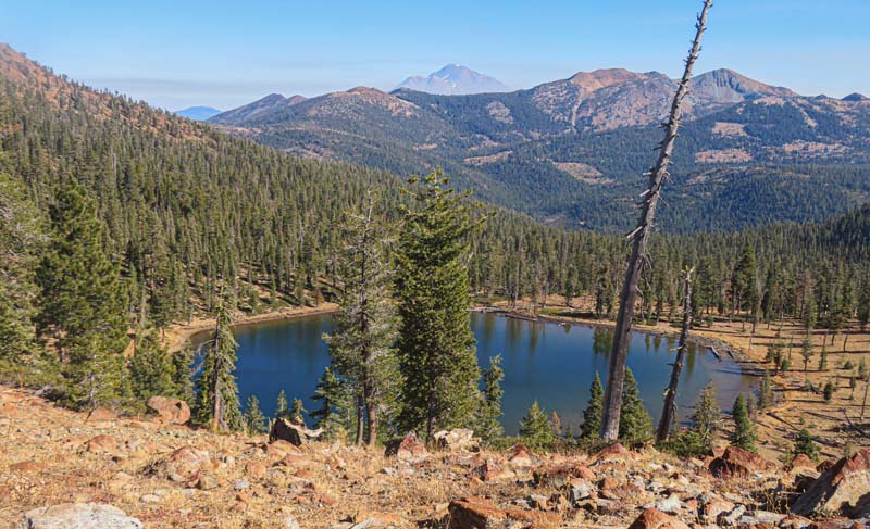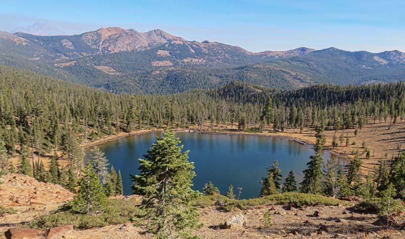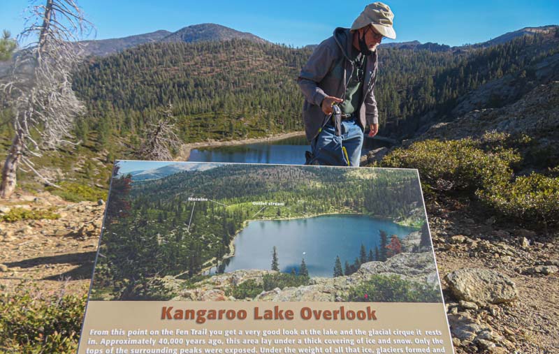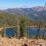 The Fen Trail offers a fairly steep climb up to the PCT with stops along the way to look down on Kangaroo Lake with occasional birds of prey seen diving for trout. At the saddle on top you can view the Siskiyous to the north and Lassen to the southeast. Also from the saddle you can look up behind you to see the monkey face rock formation.