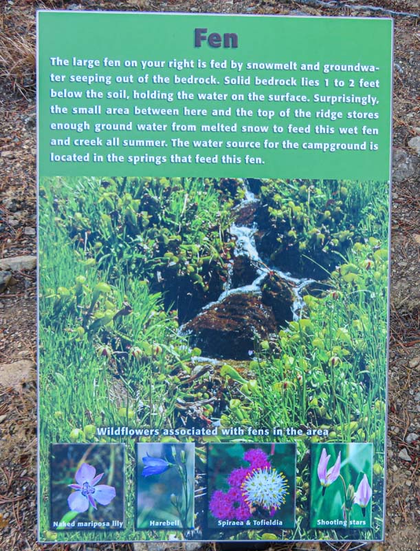 After parking in the back of the spacious lot we walked back down the road to the TH of the Fen Interpretive Trail. New signs had been posted explaining the local seasonal flowers including Bear Grass and Cobra Lilies (or Pitcher Plants), Geological formations, side hikes to Old Growth Forests, an Overlook to Kangaroo Lake, and what the heck is a Fen ( which turns out to be a creek fed by snowmelt ).