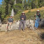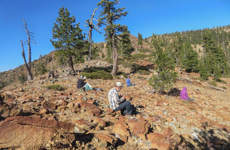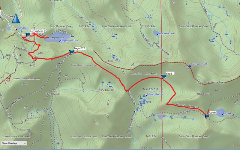 From there we pushed on towards our lunch break above Bull Lake at 7,000′ some 1,200′ above our starting point. At our lunch spot we had stunning views of Mt. Eddy and Shasta just over her left shoulder. From 7,000′ we also looked down into Robbers Meadow and wondered how hikers let alone bandits on horseback managed to get down that steep grade. We also met two mountain bikers who had traveled nine miles along the PCT from Park Creek to our perch above Bull Lake. They were on their way to Scott Mountain a 28 mile RT.