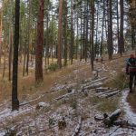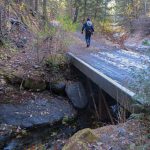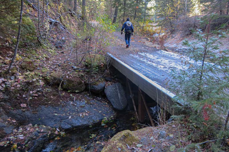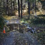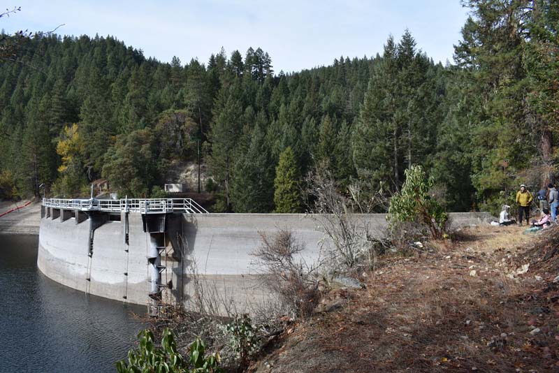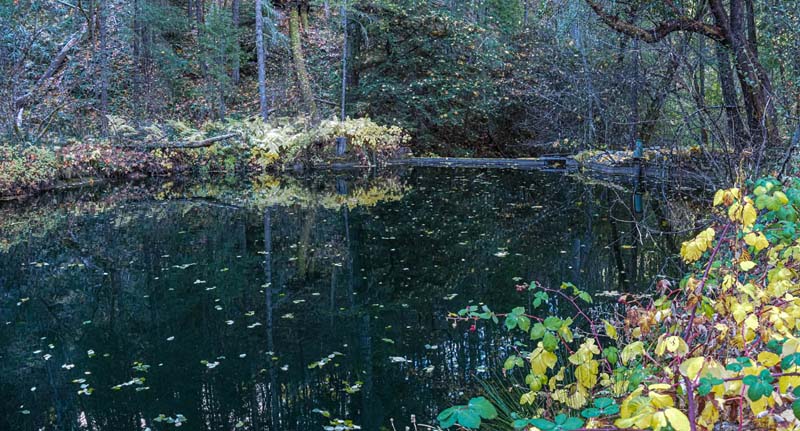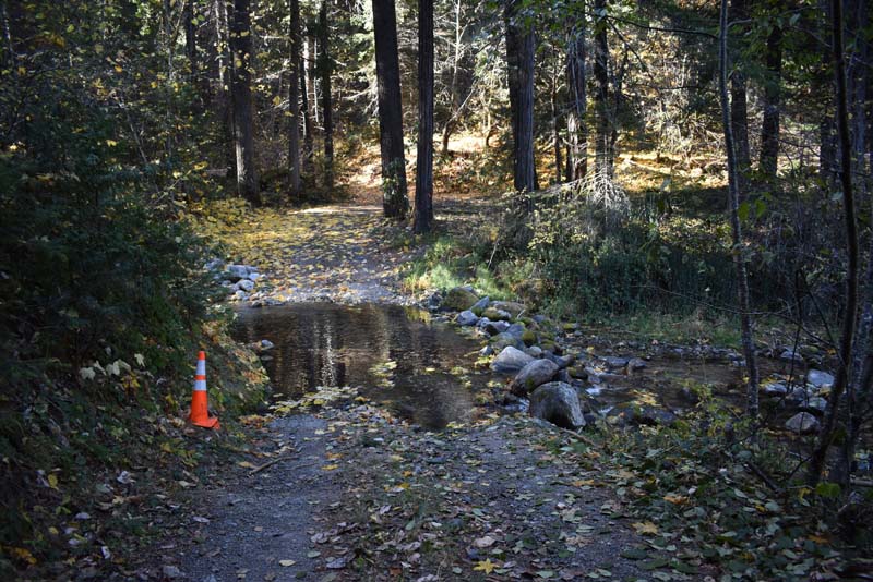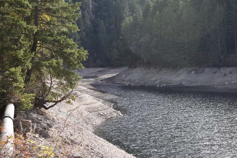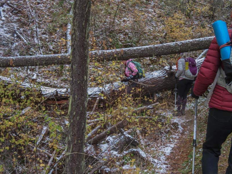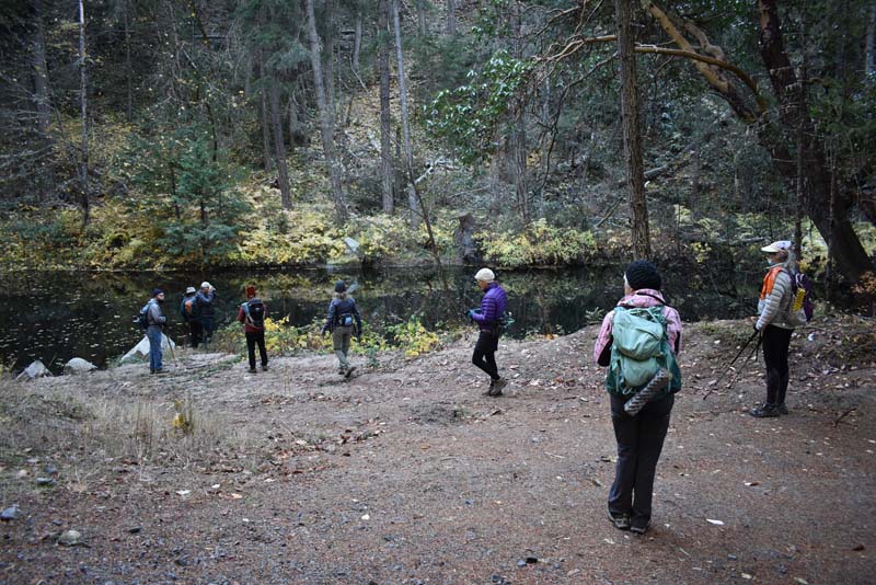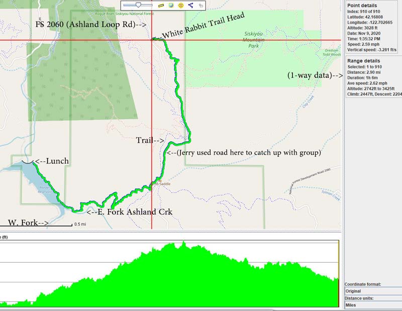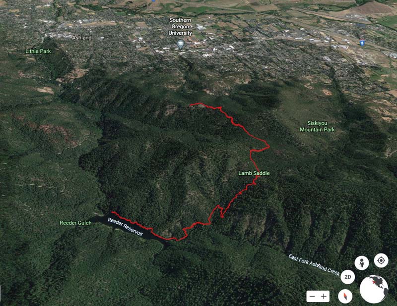 At Lamb Saddle the new part of this hike began. Back in the summer a party of four scouted the unnamed trail that descends 0.8 miles down to Reeder Reservoir. It’s a narrow, slanted trail with about 2 dozen deadfalls to get over. About 2/3 of the way down you cross a dry gorge that eventually yields the East Fork of Ashland Creek as you approach the reservoir. The sudden appearance of the creek through the trees made us think it must have an underground spring as it’s source. So we’ve named this path the Phantom Creek Trail.
