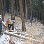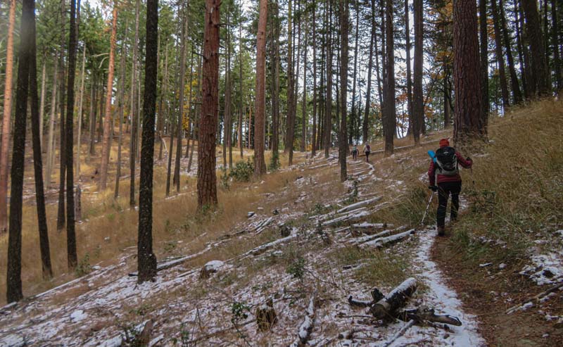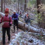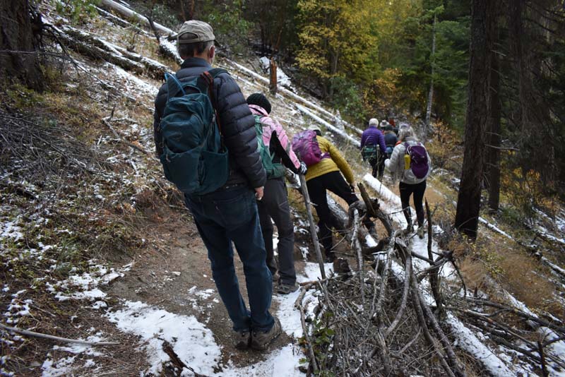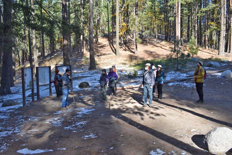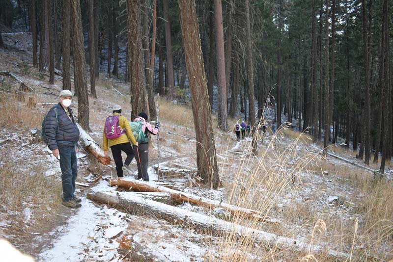 The starting temp was 30 degrees with sun as we introduced two hikers to our usual regulars. Heading up the short 1/4 mile stretch of White Rabbit we saw patches of snow on either side of the trail. We next made a right onto the Caterpillar Trail and took it for 2 miles up and around to Lamb Saddle. We passed the turn off for the Lewis Loops at about 3,500 feet.