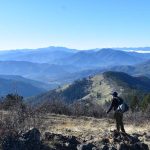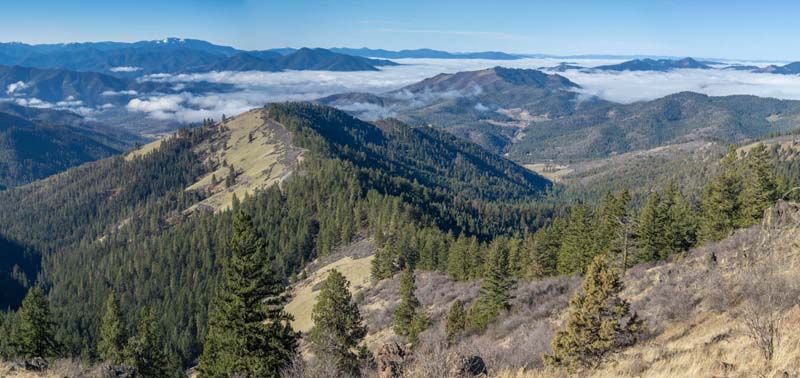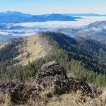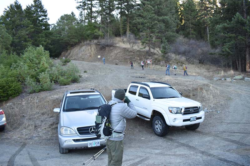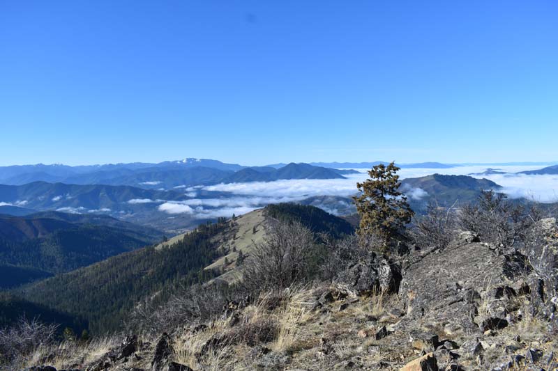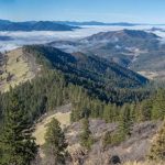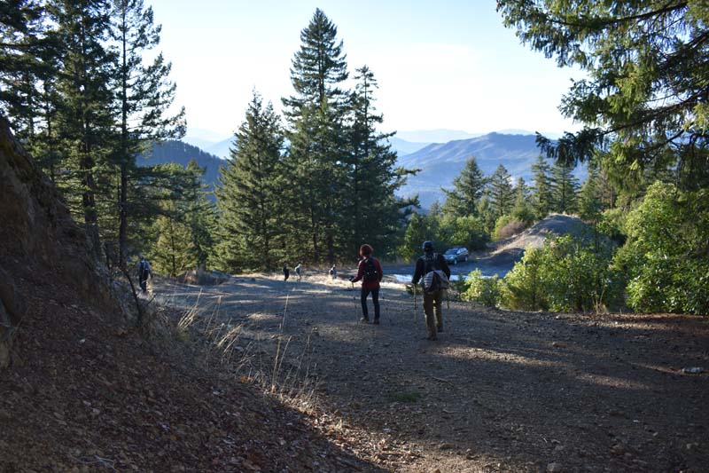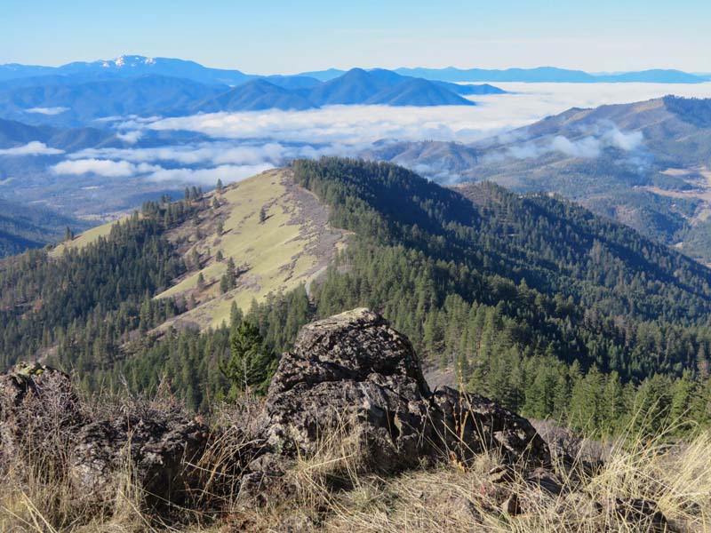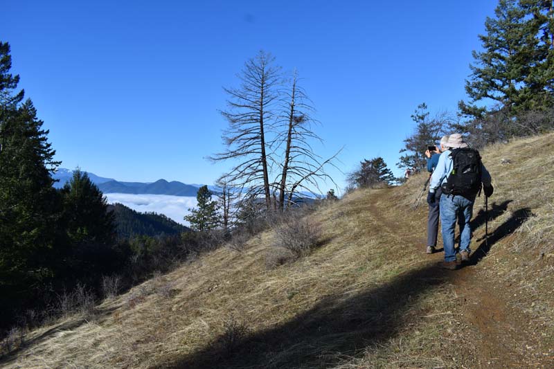 At the Ridge the group was elated at the sudden change from chilly dark forest to bright blue skies, warm sun and great views of snow covered peaks and the fog covered Little Applegate valley below.