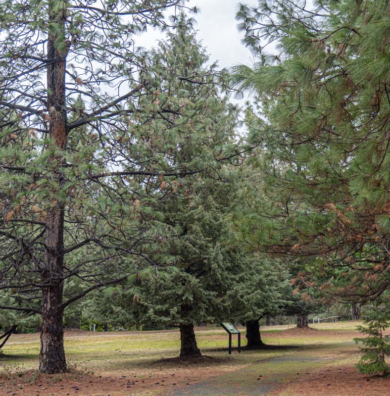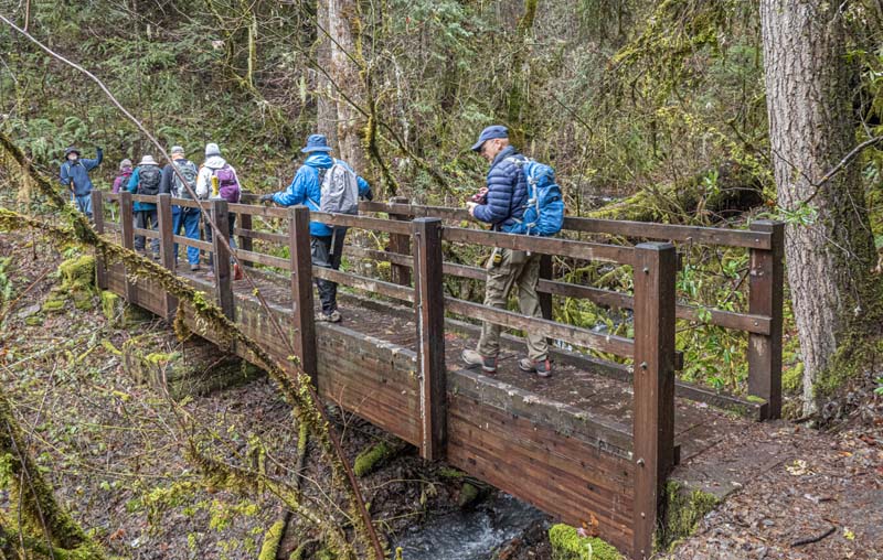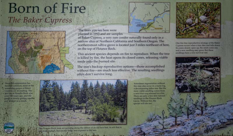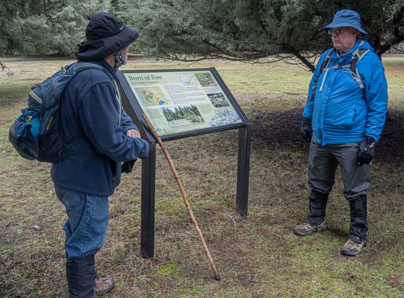 We continued on the paved trail around the park stopping at lake viewpoints, discovering Taggart Creek Falls rushing under us on the bridge and learning about the “born from fire” Baker Cypress which grows in Southern Oregon and is found on the trail.