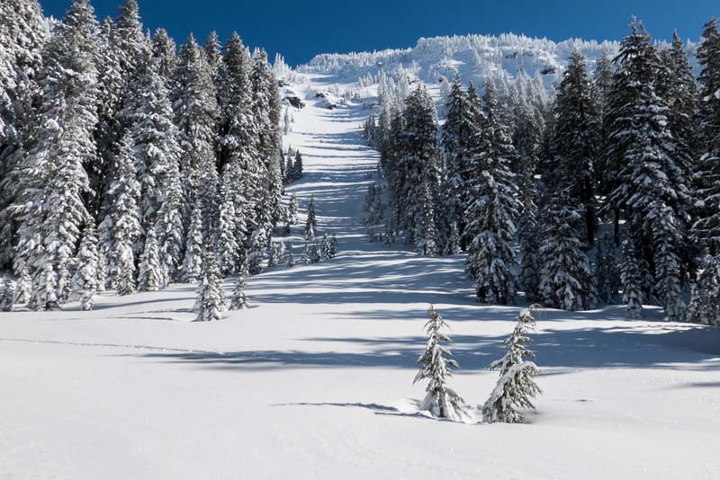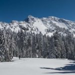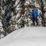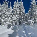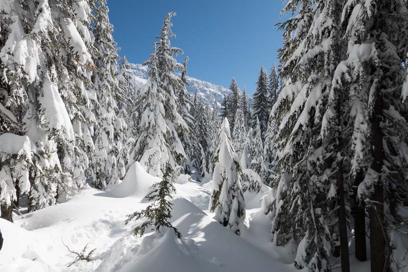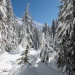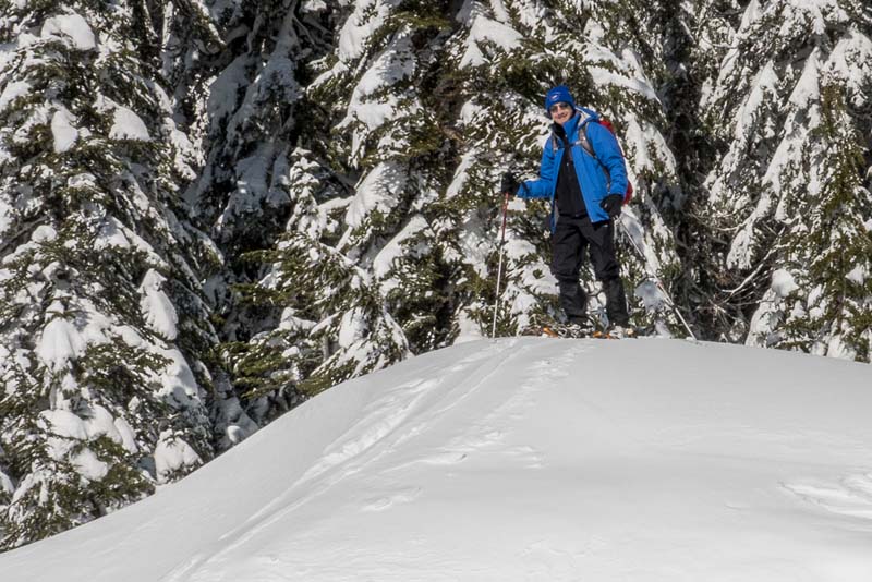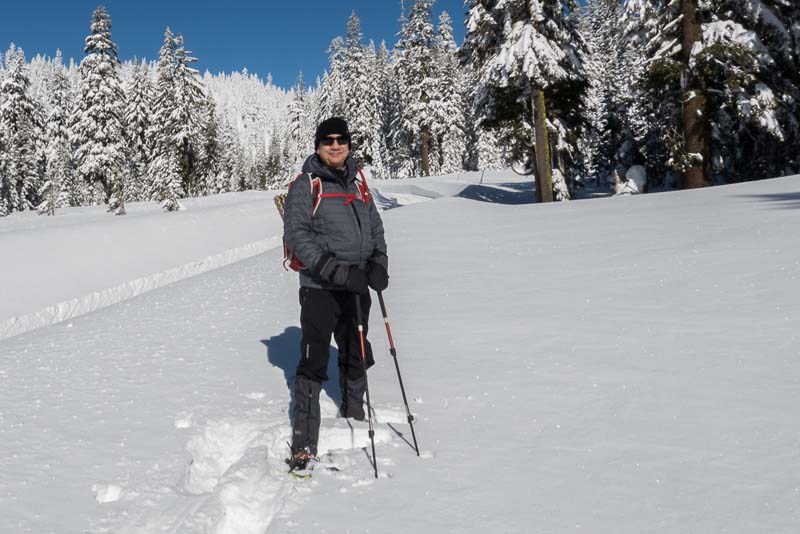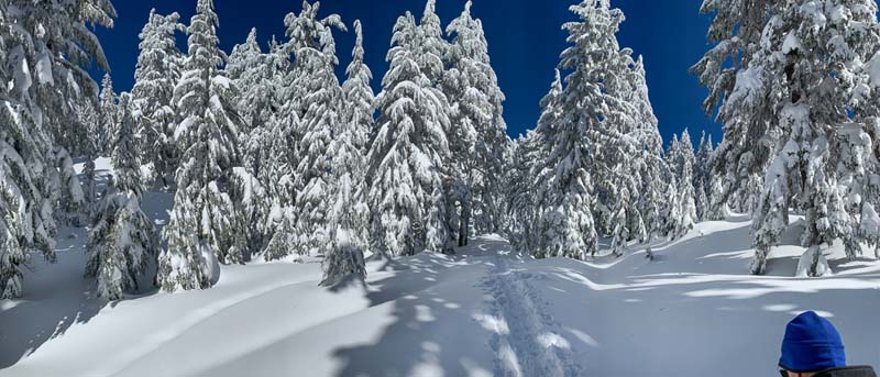 The weather was perfect – clear blue sky with 25 to 30 degree weather. We did have to cut our trail for a bit, but then joined a somewhat packed route once we got into the forest and past the avalanche meadow.