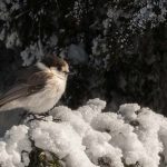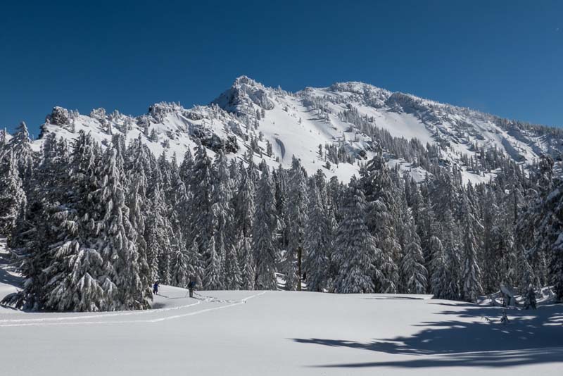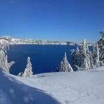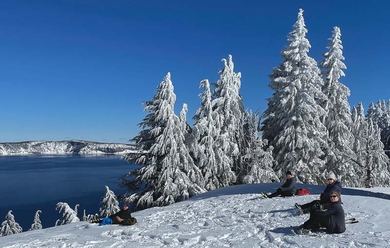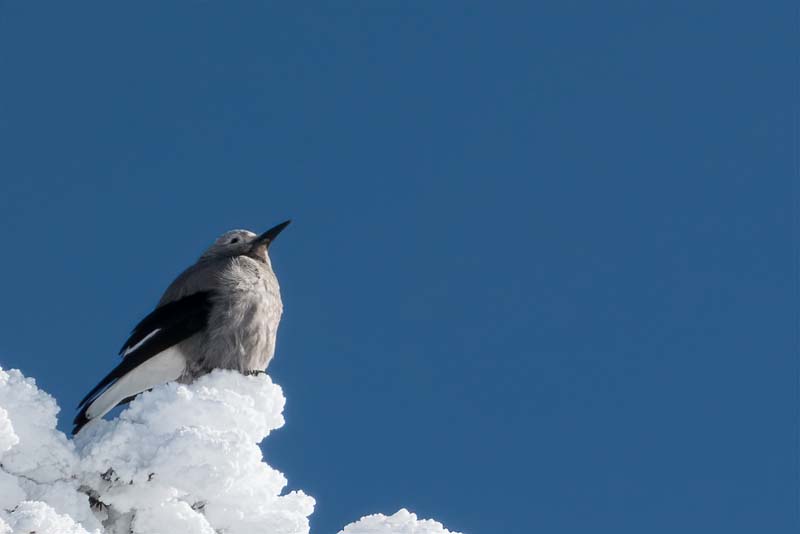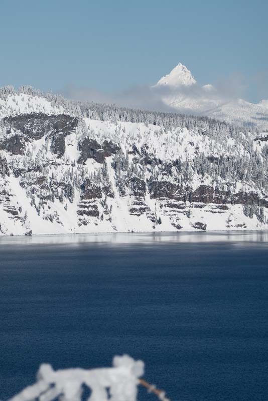 The lake was dark blue and you could see Mt. Thielsen clearly. Lunch was somewhat of a challenge because eating with gloves off caused finger tips to freeze up quickly. We did see both Clarkâs Nutcrackers and Gray Jays during lunch.