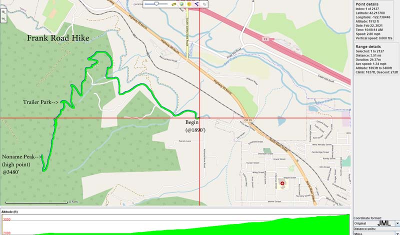 We started the hike at elevation 1,890′ and five of us went to a previously unnamed peak which we can call Frank Hill summit at 3,480′. A gain of 1,590′ and seven miles roundtrip.