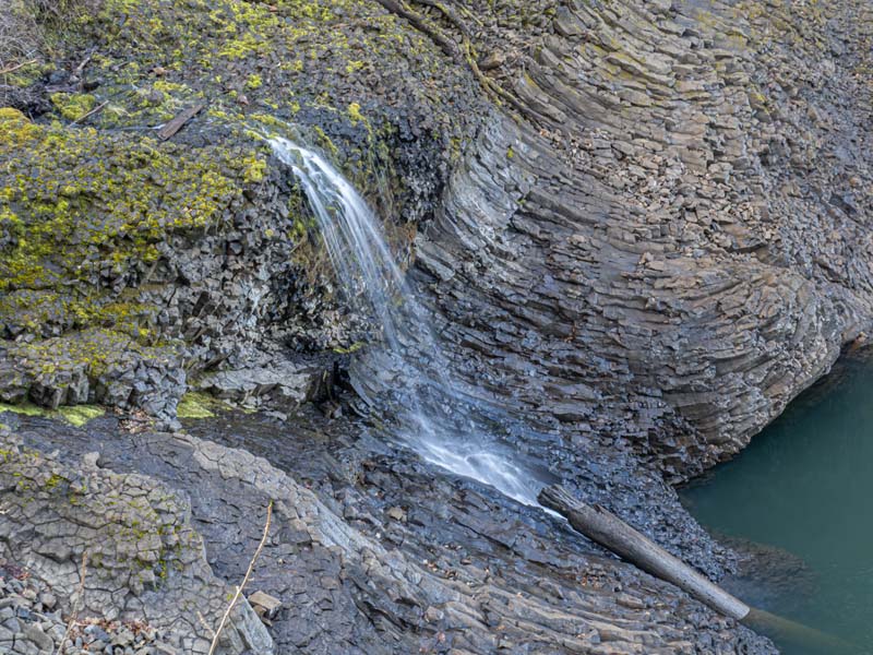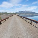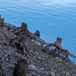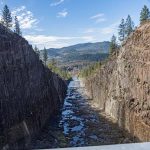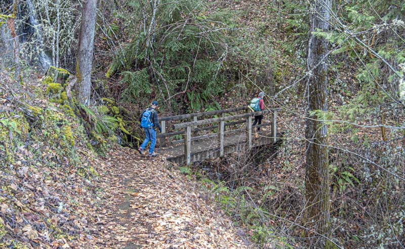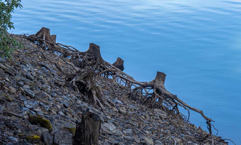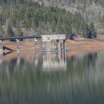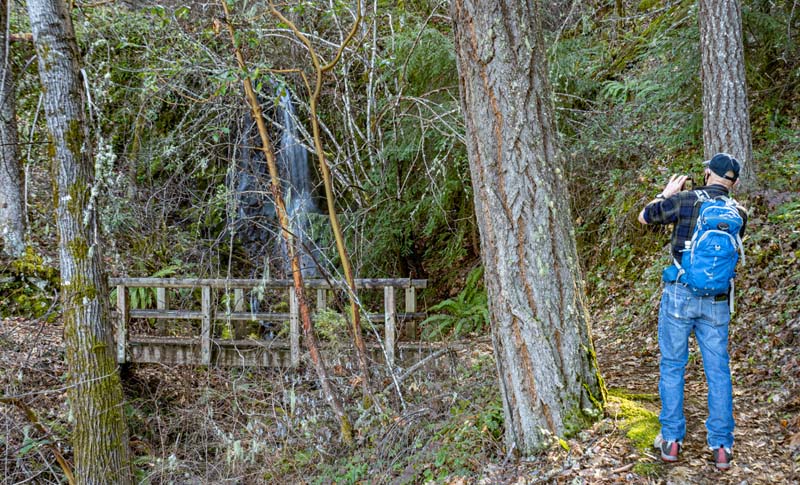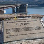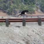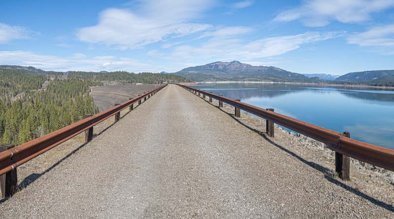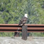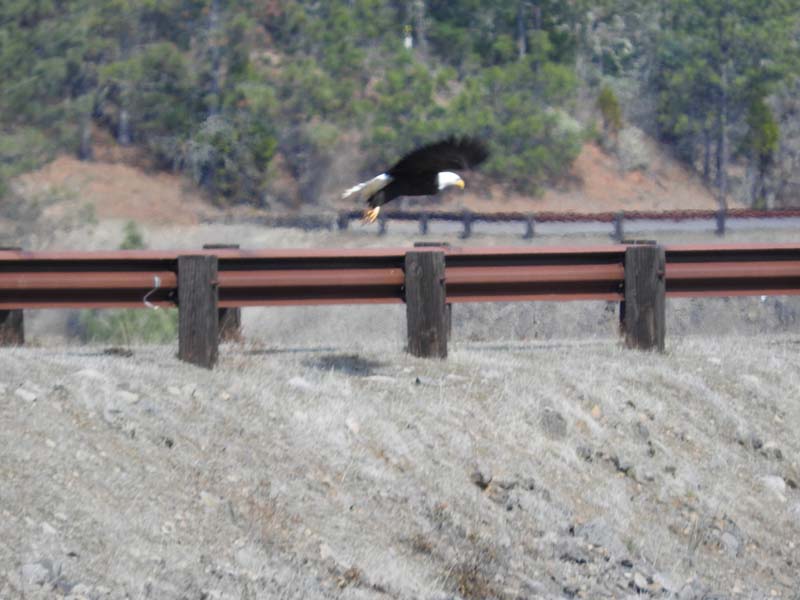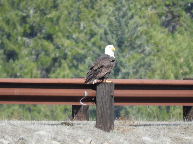 This section of the trail is gentle and at first shaded in the forest, then sunny along the shore line and up on the dam. Besides the lake with it’s boating activities, our views were Rumley Creek Falls and a Bald Eagle perched on the dam’s guard rail.