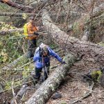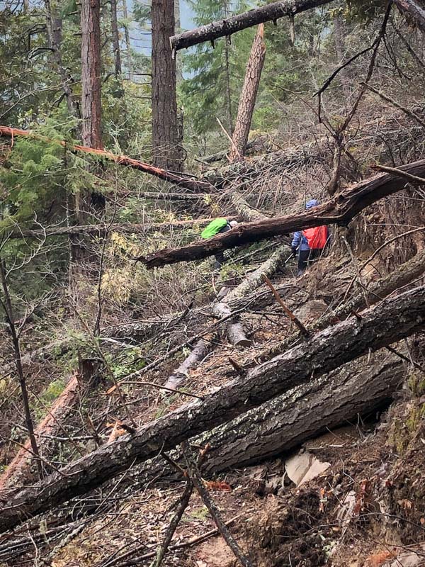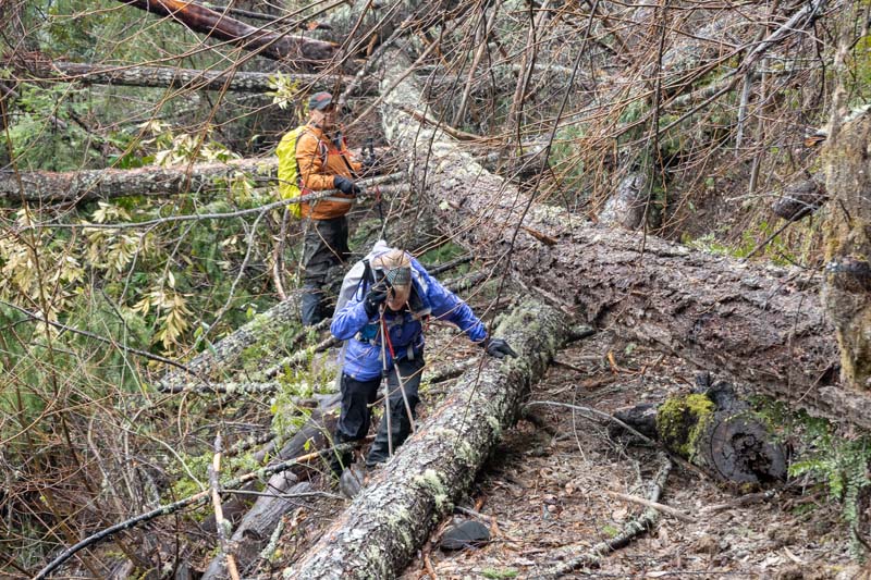 It was in the high 30’s and foggy when we started. The trail was in good shape for most of the way, but we did hit about 100 yards of deadfall that proved to be challenging (check out the pictures). Everyone was up for the challenge, so forward we went. Once past the “mess”, it was clear the rest of the way to lunch.
