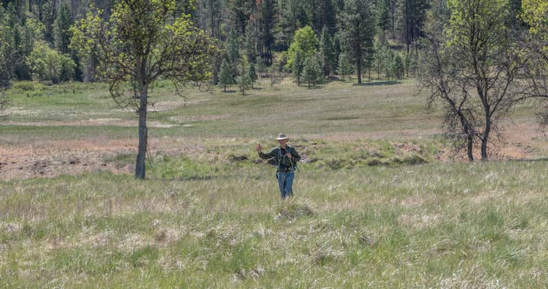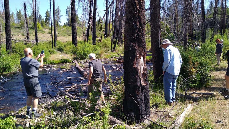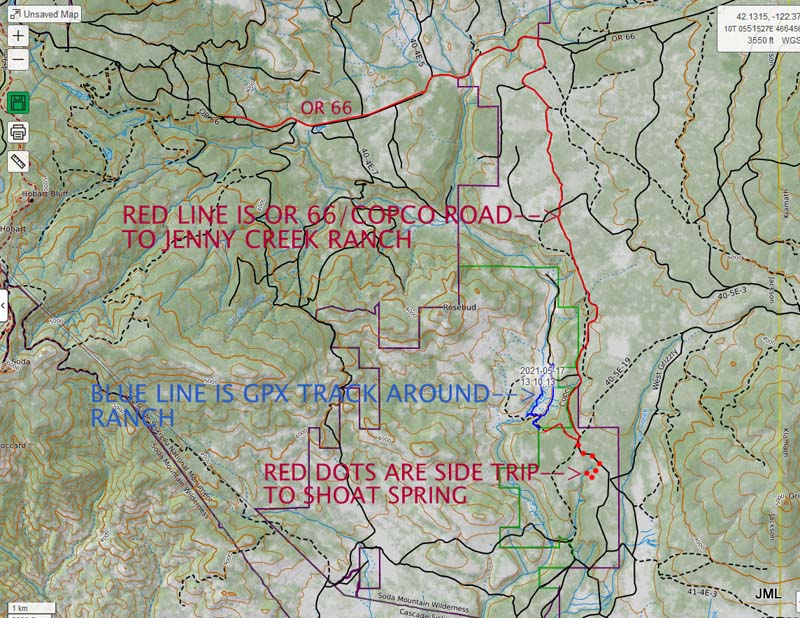 Heading out on Highway 66, our caravan of 6 vehicles followed the lead car up and over the Greensprings Summit to a right turn onto Copco Road. Once all caught up, Jerry led us down the dirt road to view Shoat Springs, streaming out of a rock wall.