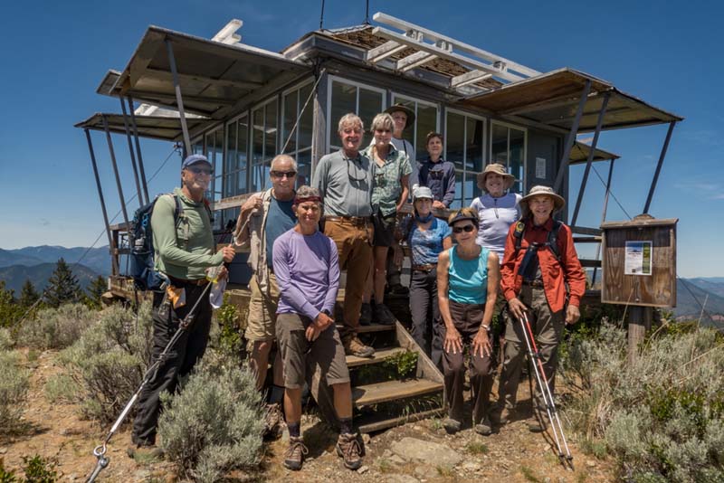 As we neared the old fire lookout, we noticed a car parked nearby. Turns out someone had rented the lookout for 3 nights and was enjoying his views. We stayed outside, but did use his decks for shade and ability to sit down during lunch. He did take out picture as we started to leave and seemed just fine with our visit.