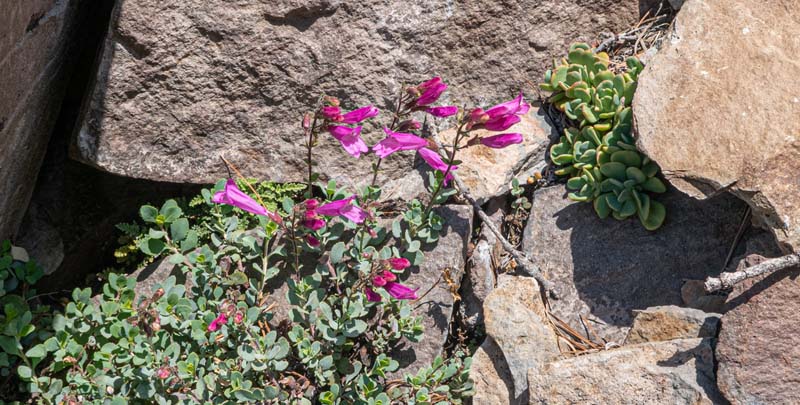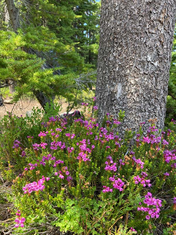 Then back to our regullarly scheduled program as I led our remaining six members around the lake with a stop on the northside for lunch at a spot where you can view both lakes on either side. These pristine mountain lakes are at 6,500′ with jumping trout and a view of Devil’s Peak at 7,400′. Much of the shoreline is rimmed with a groundcover of flowers, including Erica or Mountain Pink Heather.