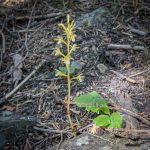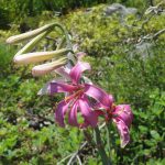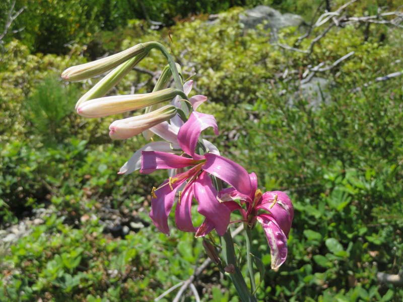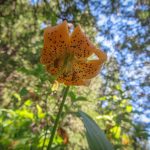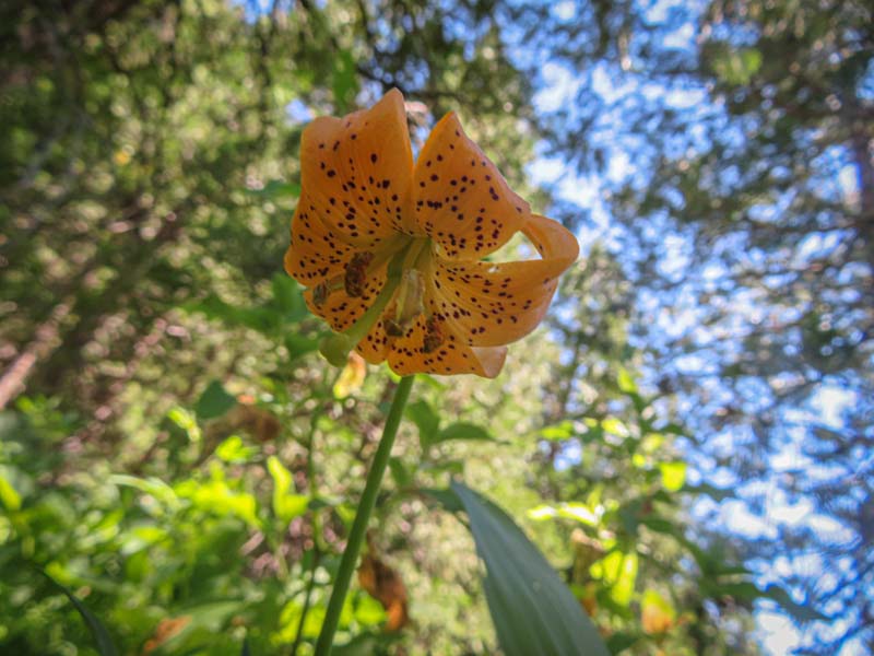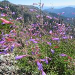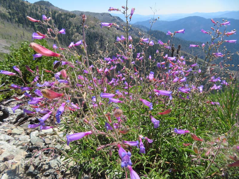 All along the 5 mile trail out to the lake overlook there was lots of color from many varieties of wildflowers. To mention a few, there were orchids in the forest both Coralroot and Rattlesnake along with Wild Ginger hiding under their heart shaped leaf; Azure blue Penstemons lit up the whole 5 miles; and in the last mile Washington Lilies bloomed white then turned a rosy pink. Many other flowers are pictured in this post.