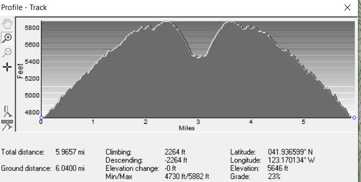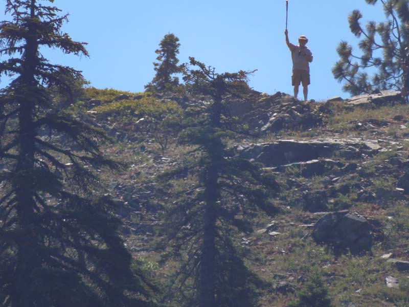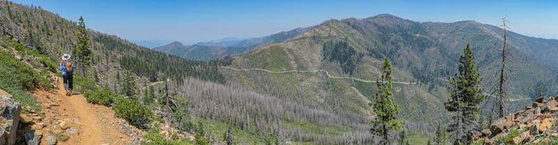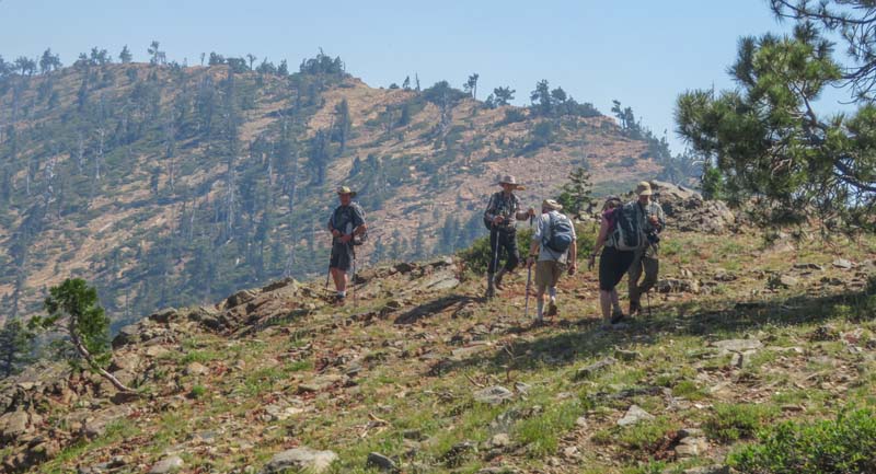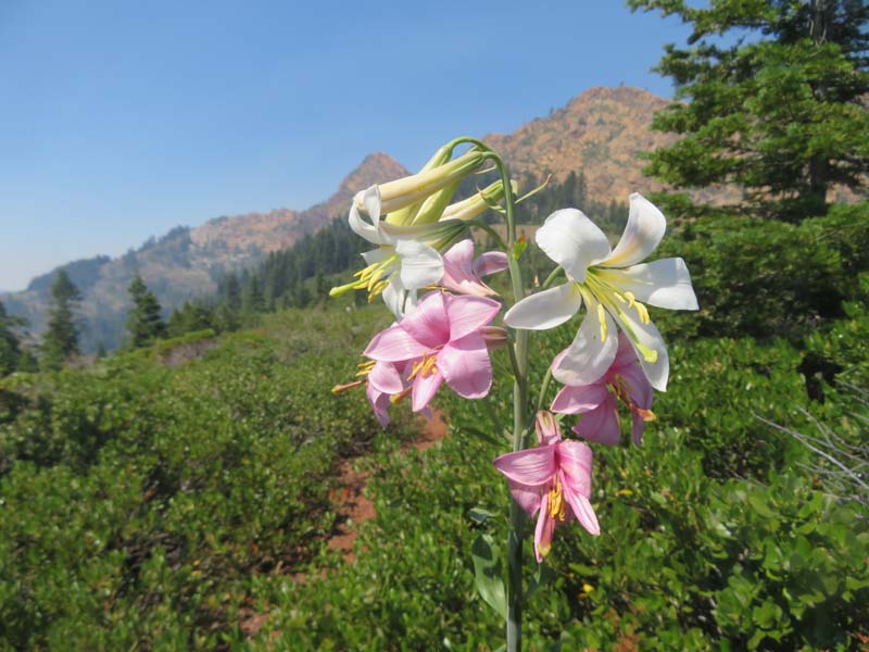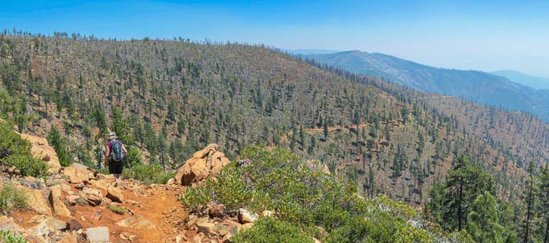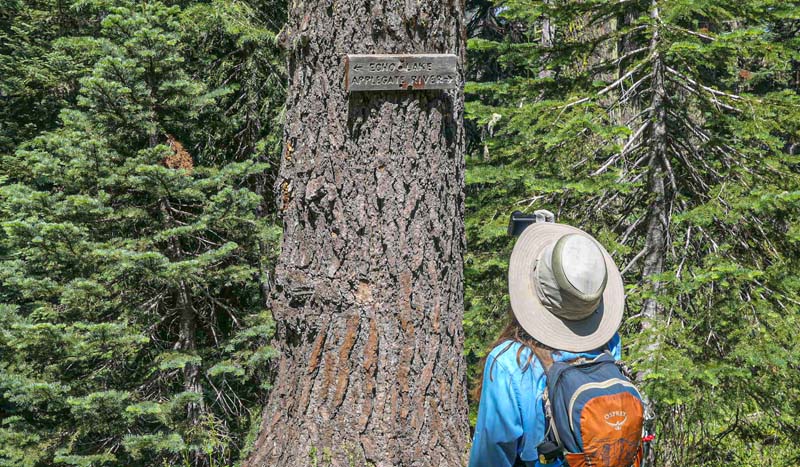 Monday’s hike up on the PCT from Cook & Green Pass proved to be an excellent way to escape the heat in the Rogue Valley. An early start helps, too, so we started out at 8 am. We came together at the parking area for the Cook & Green TH. At 9:45 it was 66 degrees at 4,730′ with blue skies above and smoke surrounding near and distant peaks.