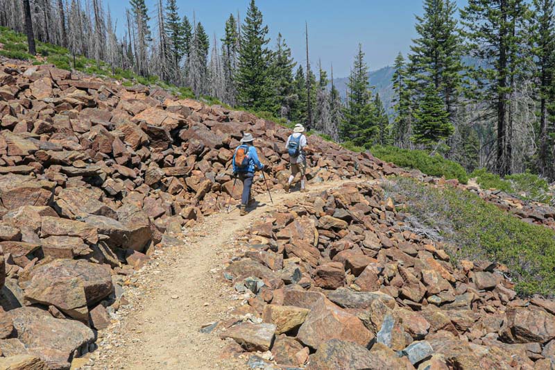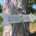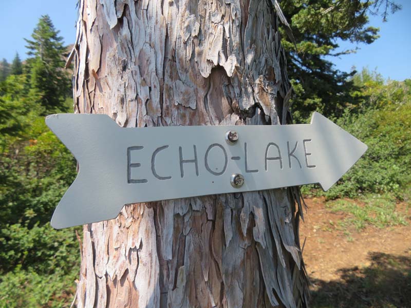 The trail starts out going up through a shady forest then alternates between sunny stretches of reddish rock trails and back into forests. A steady climb of 1,300′ for 2.5 miles brought us to the ridge overlooking Echo Lake.