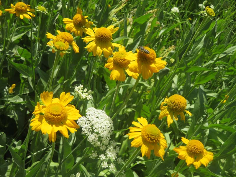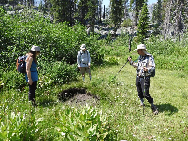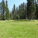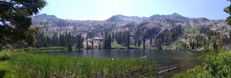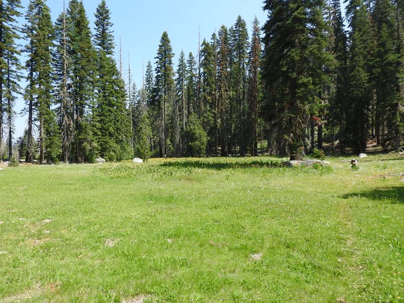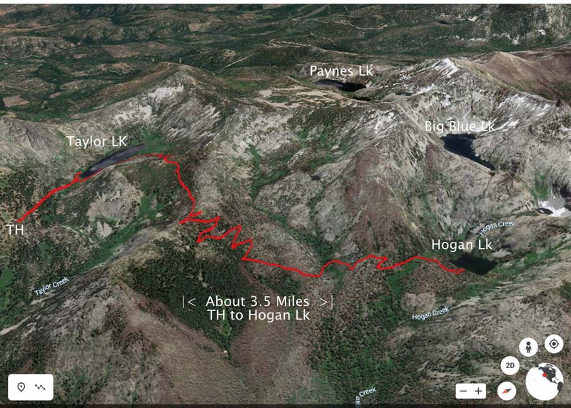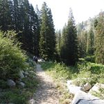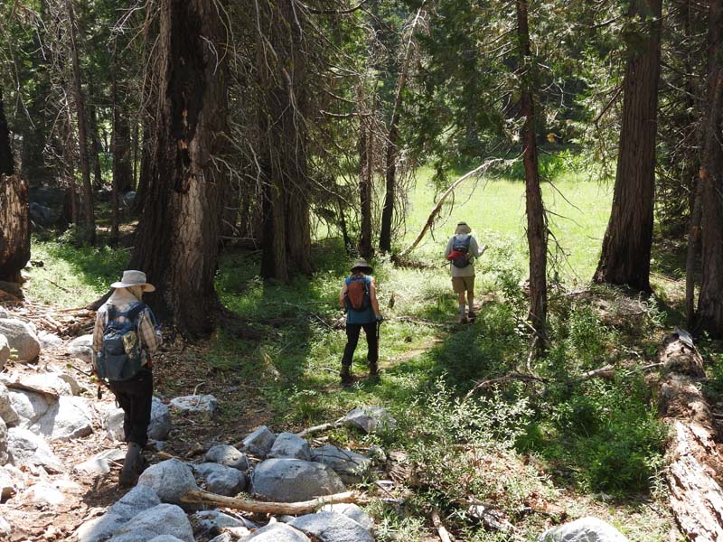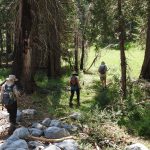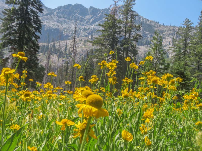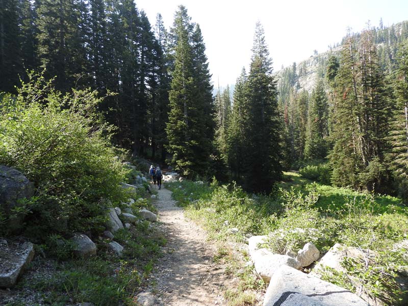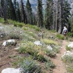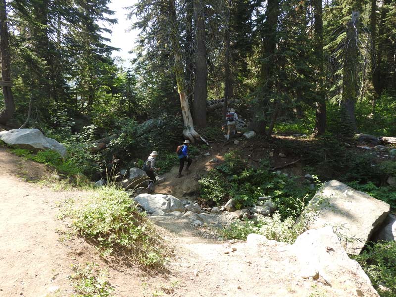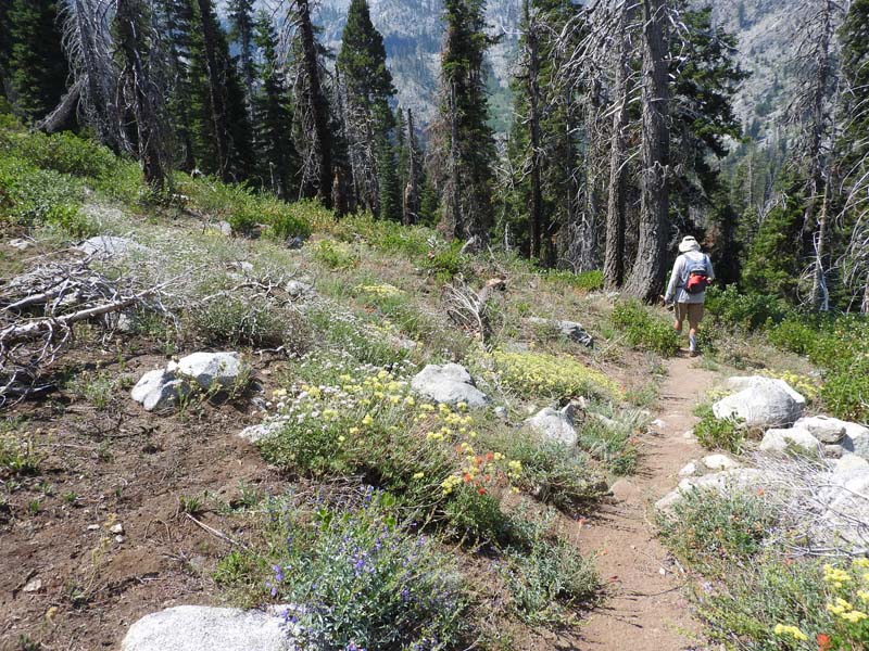 The Hogan trail wraps around the westside of Taylor and then switchbacks into the forests above the lake. Taylor Lake is at 6,400′ as is the parking. The 3.2 mile trail to Hogan takes you up to about 6,900′ followed by a long descent through green, flowering meadows to Hogan Lake at 6,000′. We had a relaxing lunch at Hogan. Both lakes are suitable for swimming, but at lunch we spent our time admiring the granite walls rising up from the lake with water streaming down from springs in the rocks.