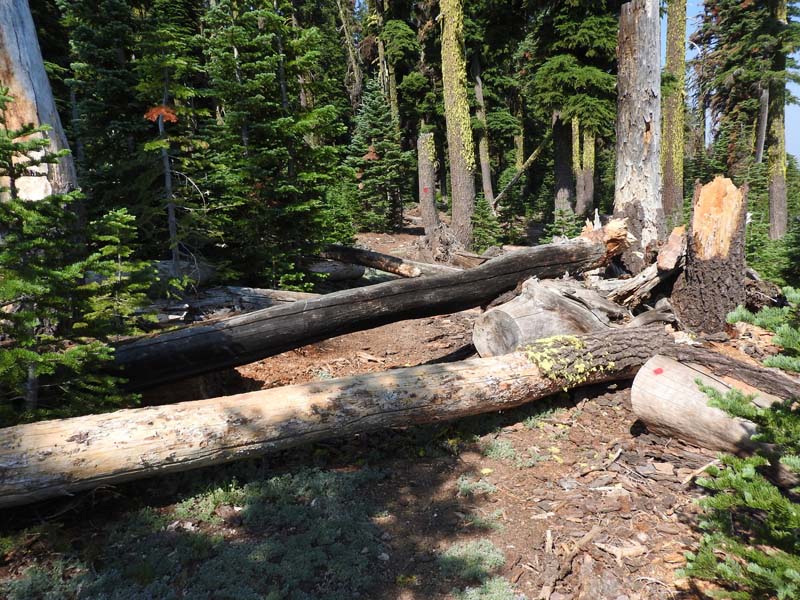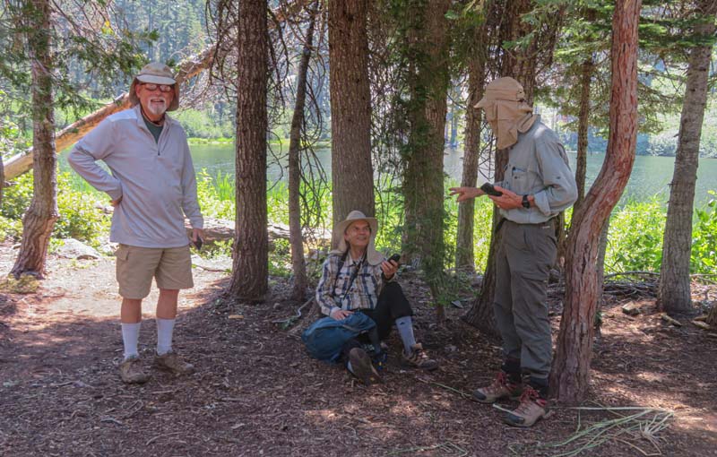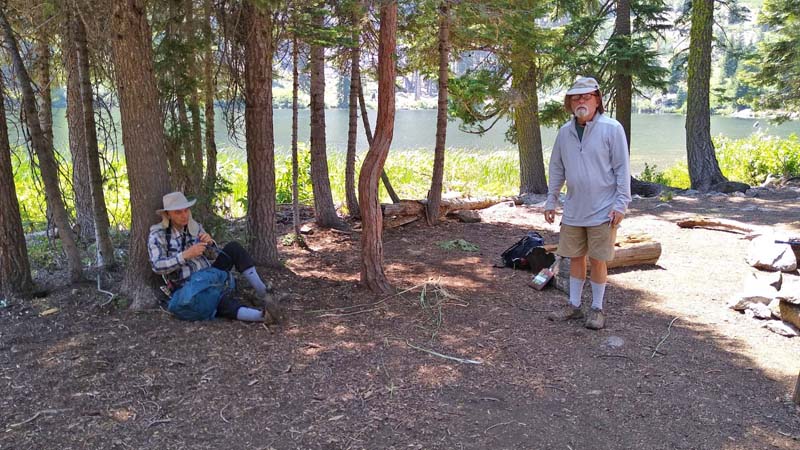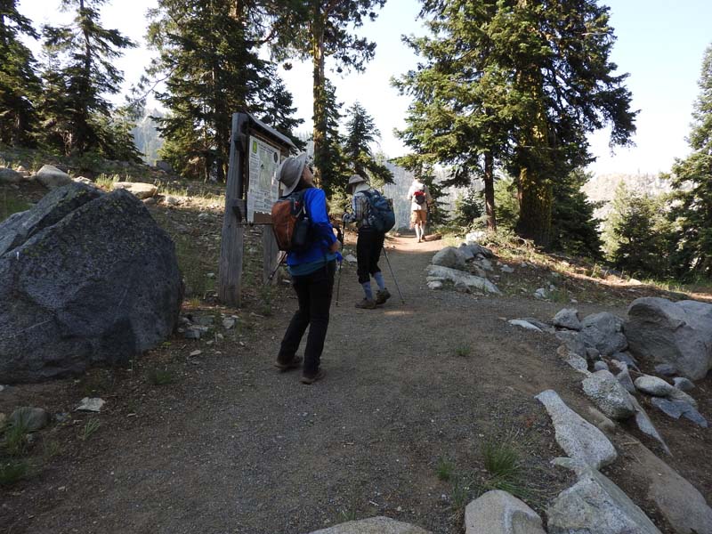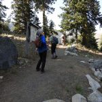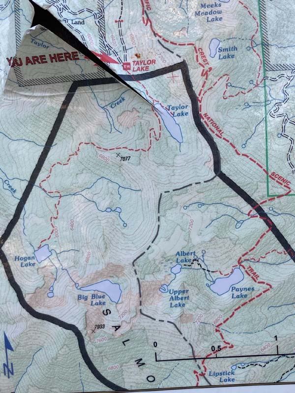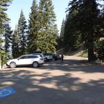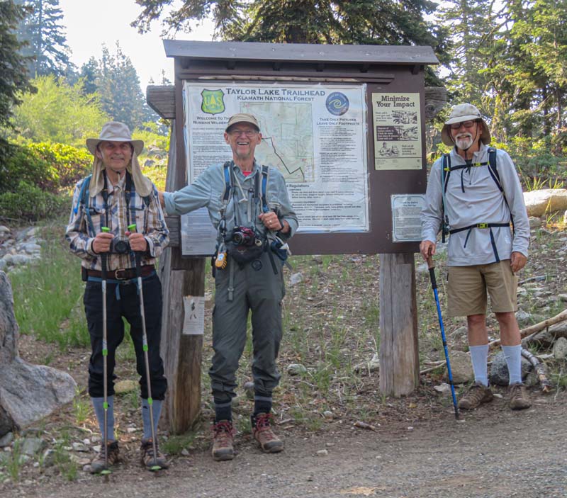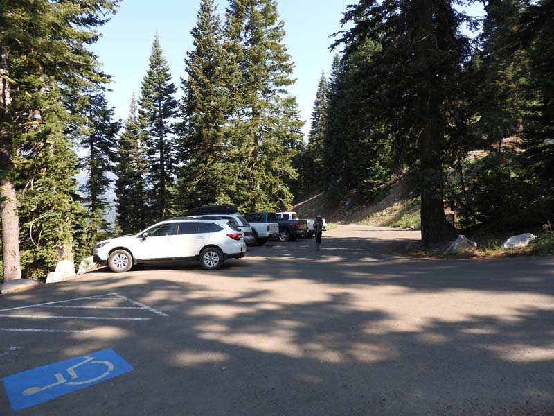 Jerry and I met up with Randy and Linda just past the summit where the PCT heads south. They followed us 1/4 mile down the road to the turn off on the left marked by the sign “Taylor Lake TH 2 miles”. It’s a rough and rocky uphill dirt road that you take slow but finally come to a nice paved parking area with a pit potty.