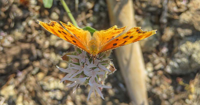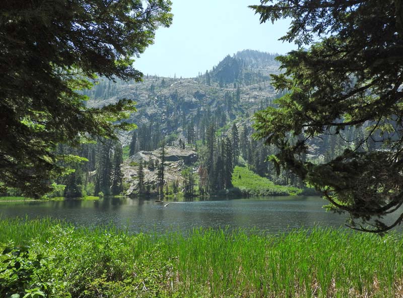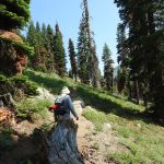 It’s a short walk over to Taylor Lake. A sunny lake that had blooming lily pads near the north shoreline. We’d fully enjoy Taylor when we returned from our hike to Hogan Lake; but now we walked back to the sign for Hogan and started this new hike by crossing a dried creek.