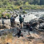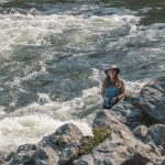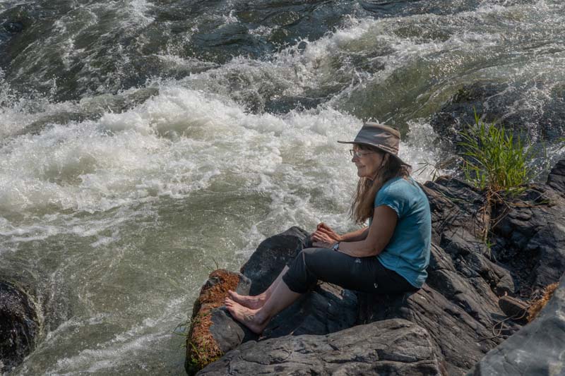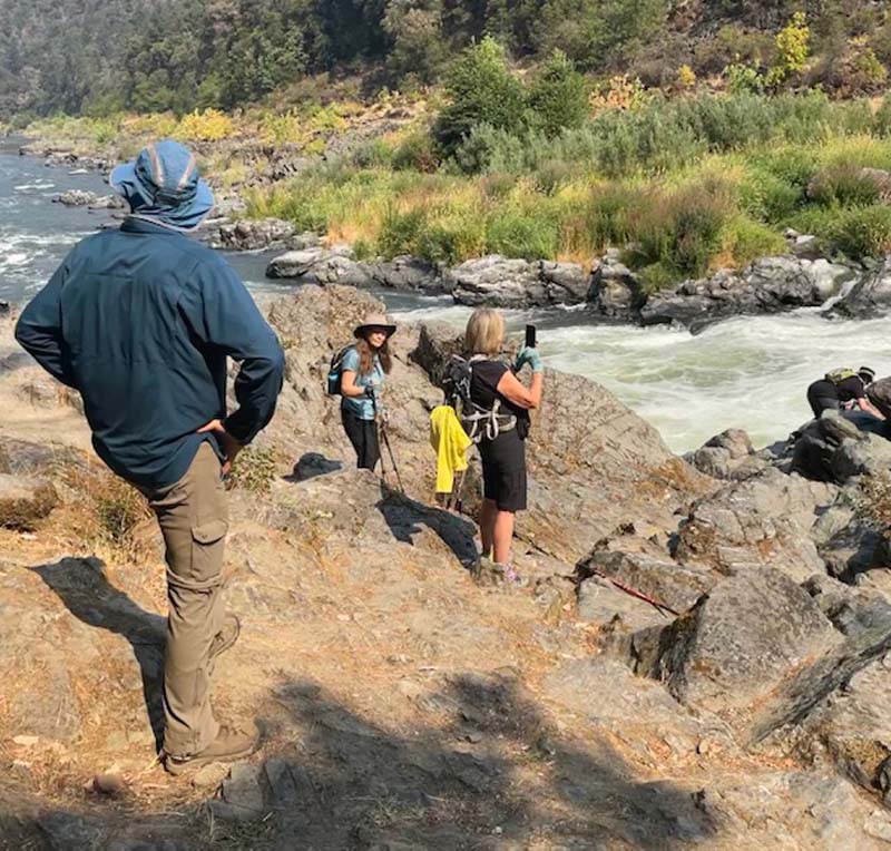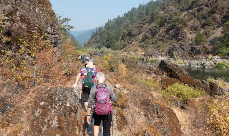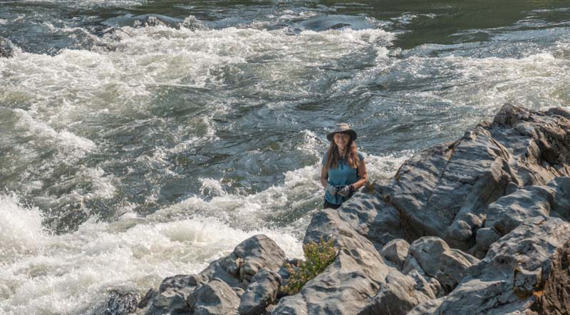 Liz was fascinated watching the salmon jumping up the 45 degree wash falls. She counted six fly by from her perch on a giant boulder. The rest were either soaking their feet in the Rogue, or watching the procession of rafts and blow up kayaks making their way down the river in front of us. Many rafts got stuck in the bypass channel on the farside of the river and the pilots struggled to loosen their crafts but all finally made it through.